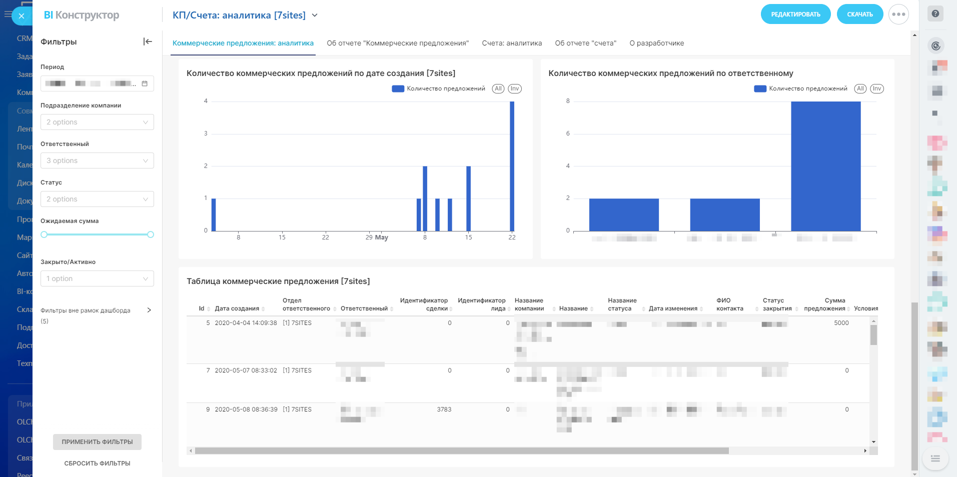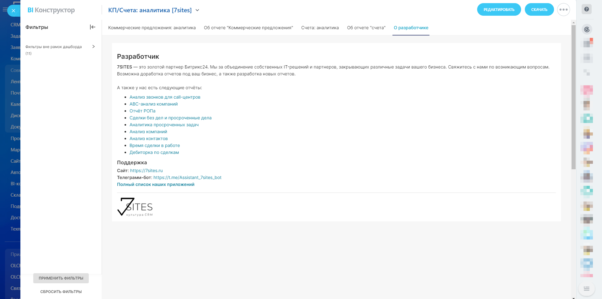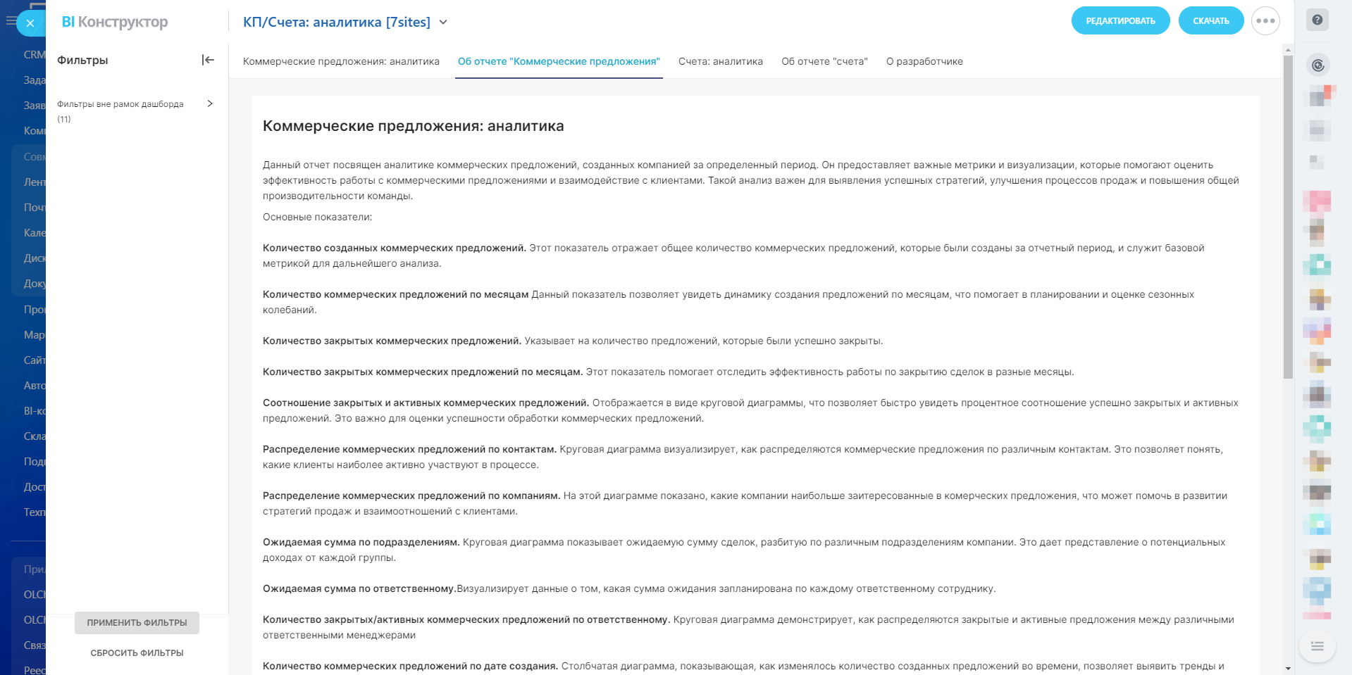 Отчет «Коммерческие предложения: аналитика» является важным инструментом для анализа процесса коммерческих предложений в компании. Он обеспечивает прозрачность, помогает выявлять узкие места и позволяет оптимизировать подход к работе с клиентами, что в конечном итоге способствует увеличению эффективности продаж и повышению доходности компании.