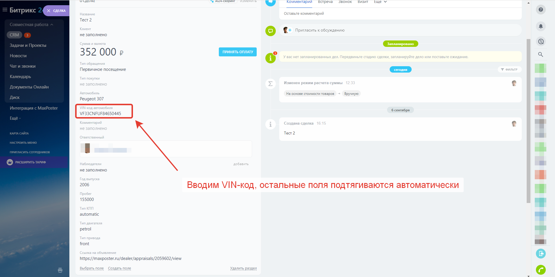 Интеграция позволяет автоматически заносить поля в сделку из оценки автомобиля, созданной в MaxPoster. Также в сделку отправляется ссылка на объявление для удобного перехода из сделки Битрикс24 в оценку в личном кабинете MaxPoster.
