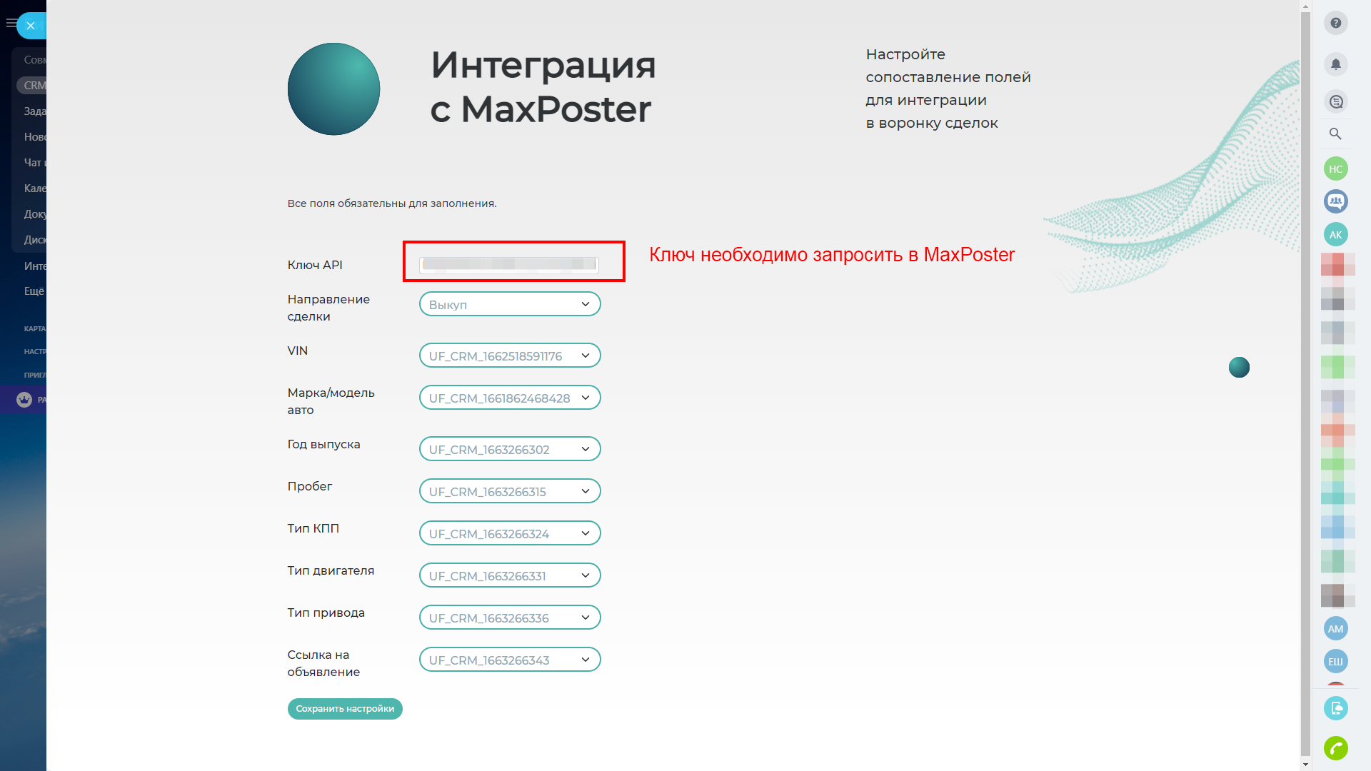 Для начала работы необходимо сопоставить поля оценки MaxPoster и сделки Битрикс24.