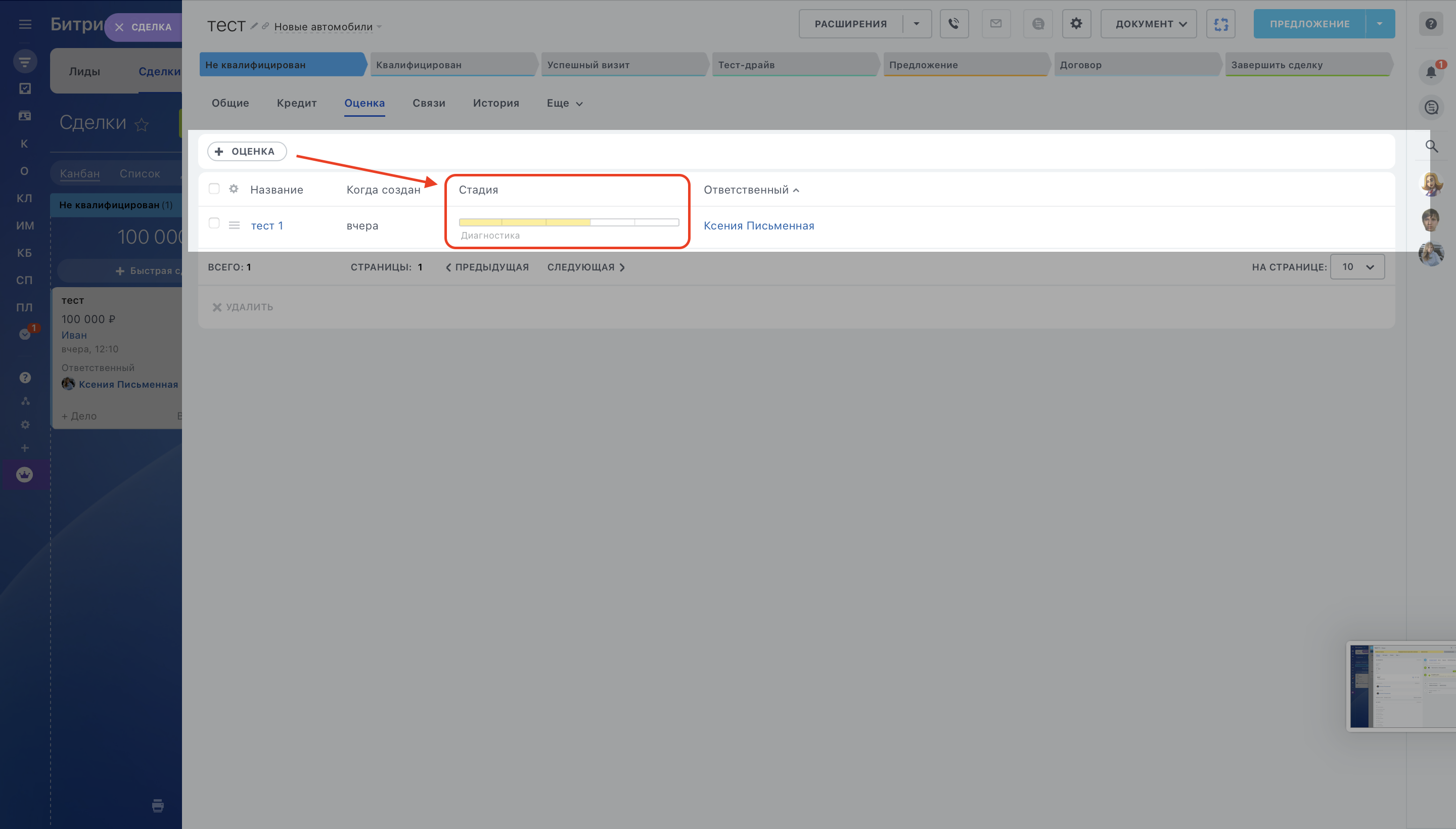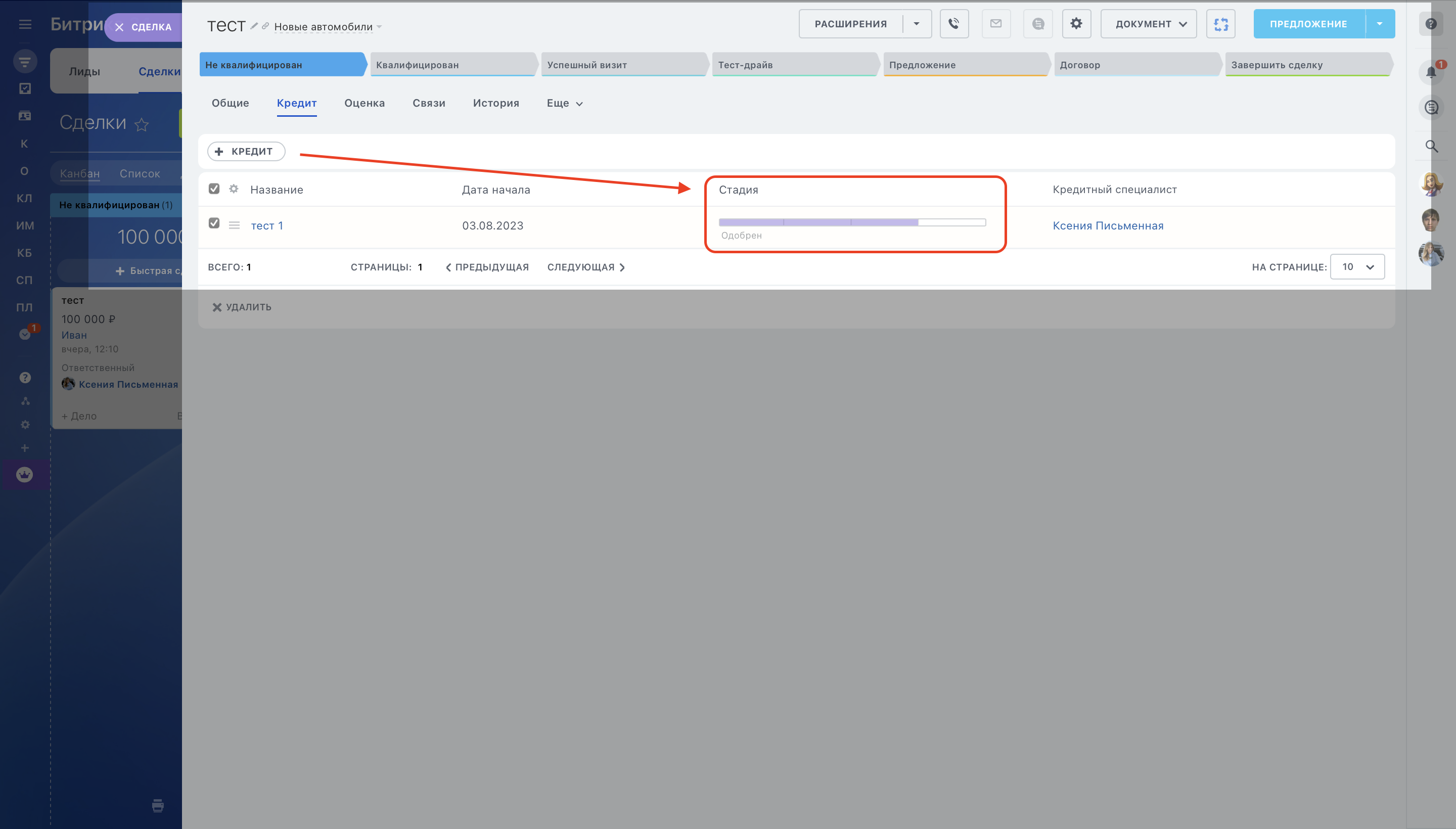 - Тест-драйв - стадия отслеживает факт прохождения тест-драйва, как одного из ключевых факторов, влияющих на успех сделки