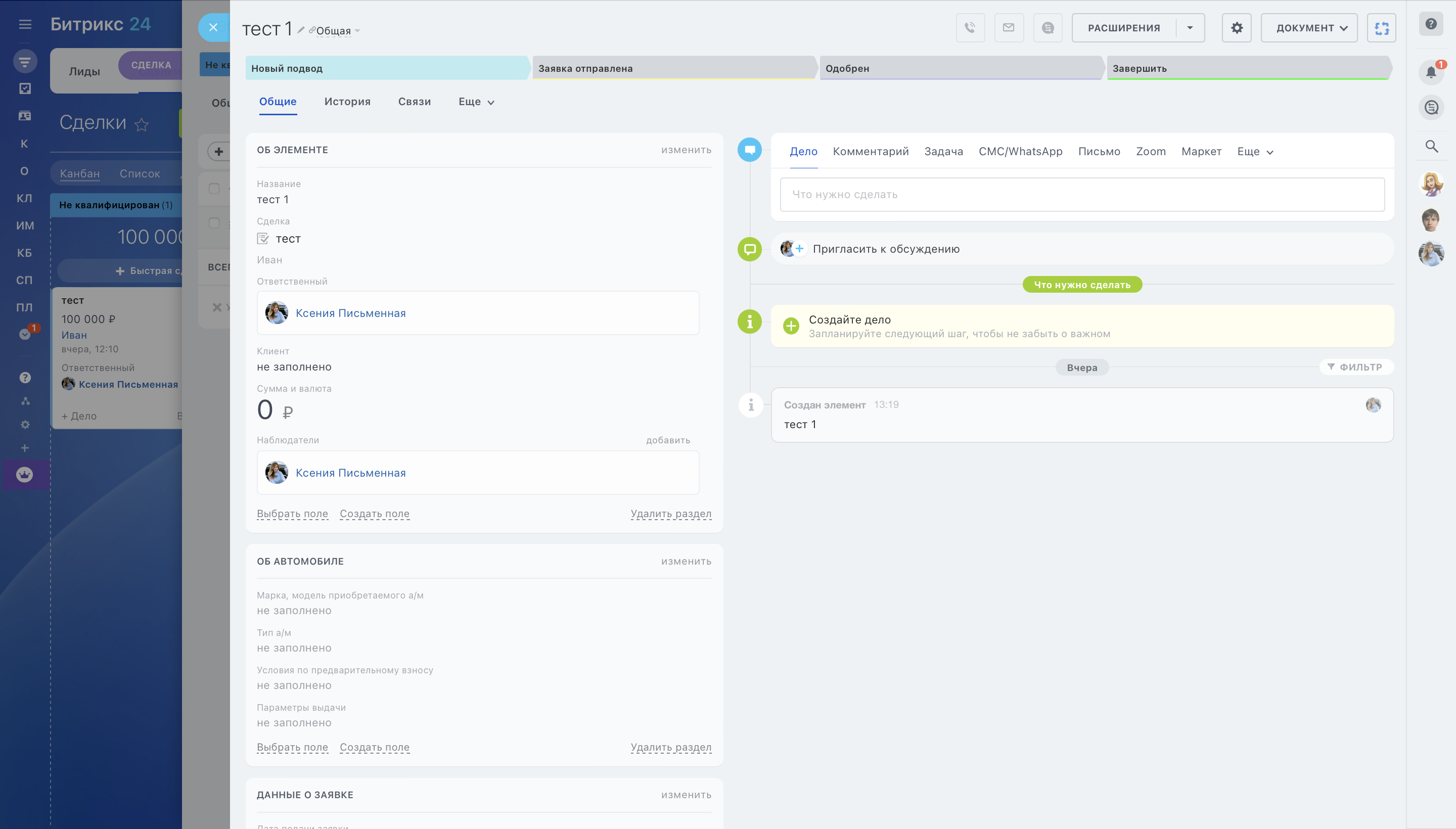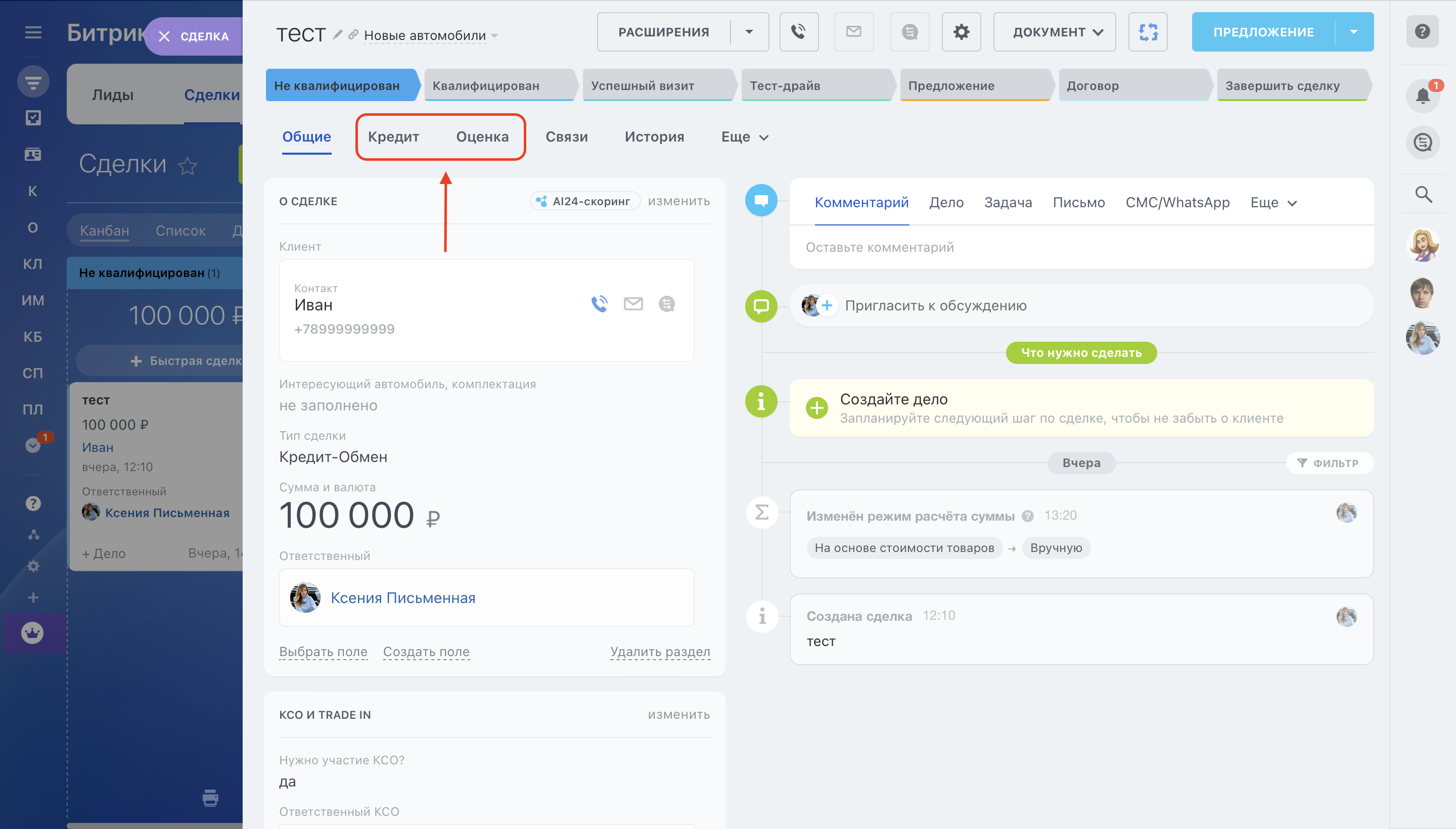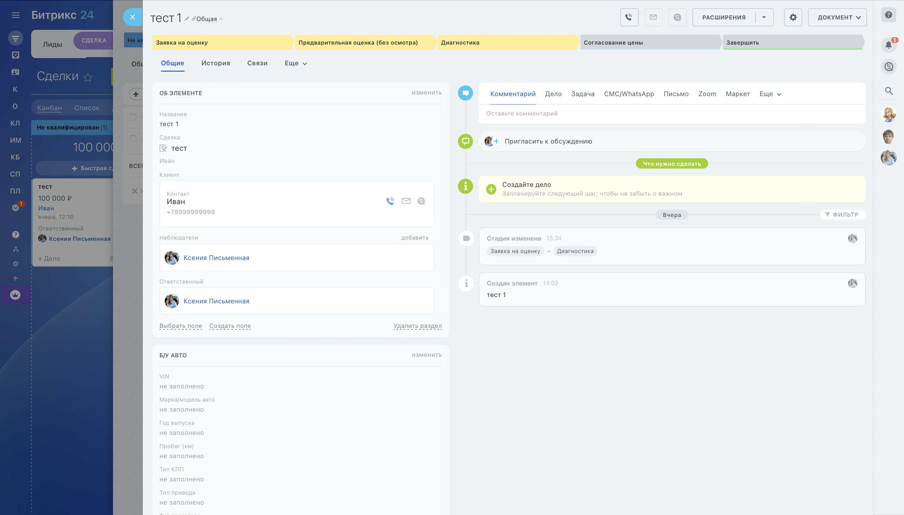 Алгоритм действия прост: если менеджер отдела продаж отмечает в сделке, что необходимо участие кредитного специалиста и оценщика – автоматически создаются карточки заявки на кредит и оценки б/у автомобиля клиента, ответственные специалисты получают уведомления.