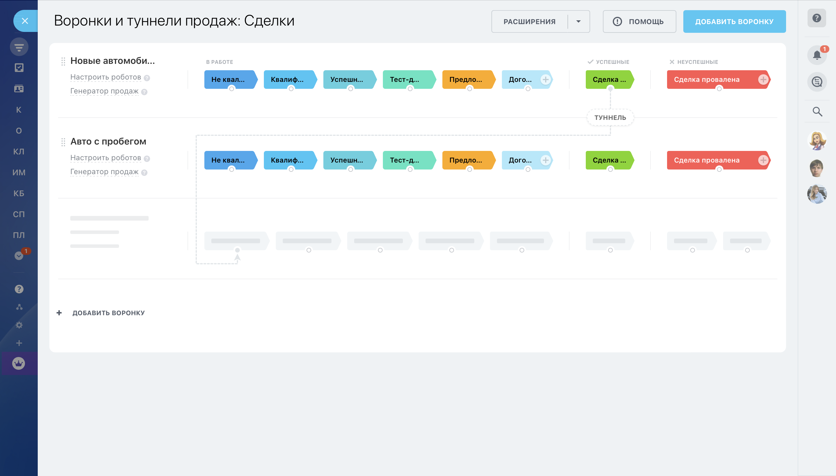 - На тарифах Профессиональный и выше доступно: воронка по лидам, 2 воронки продаж (новые и б/у автомобили), смарт-процессы внутри сделки – Кредит, Оценка; бизнес-процессы автоматического создания карточек Кредит и Оценка, бизнес-процесс по автоматическому расчету суммы премии про кредитно-страховым продуктам.