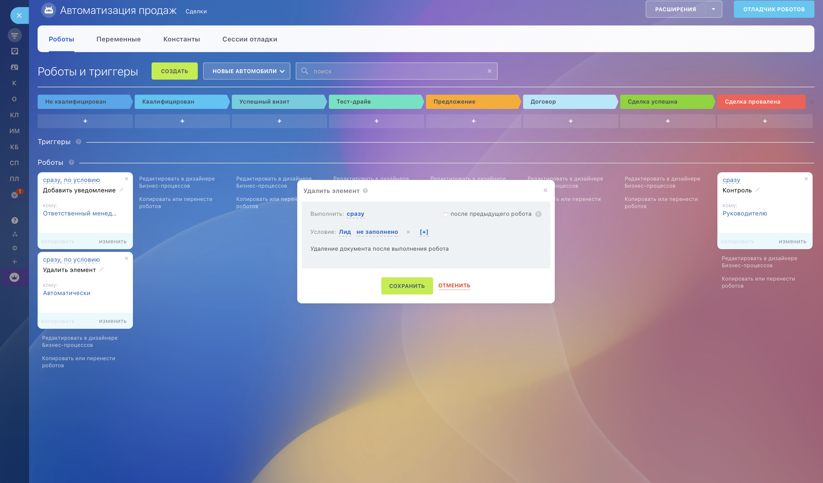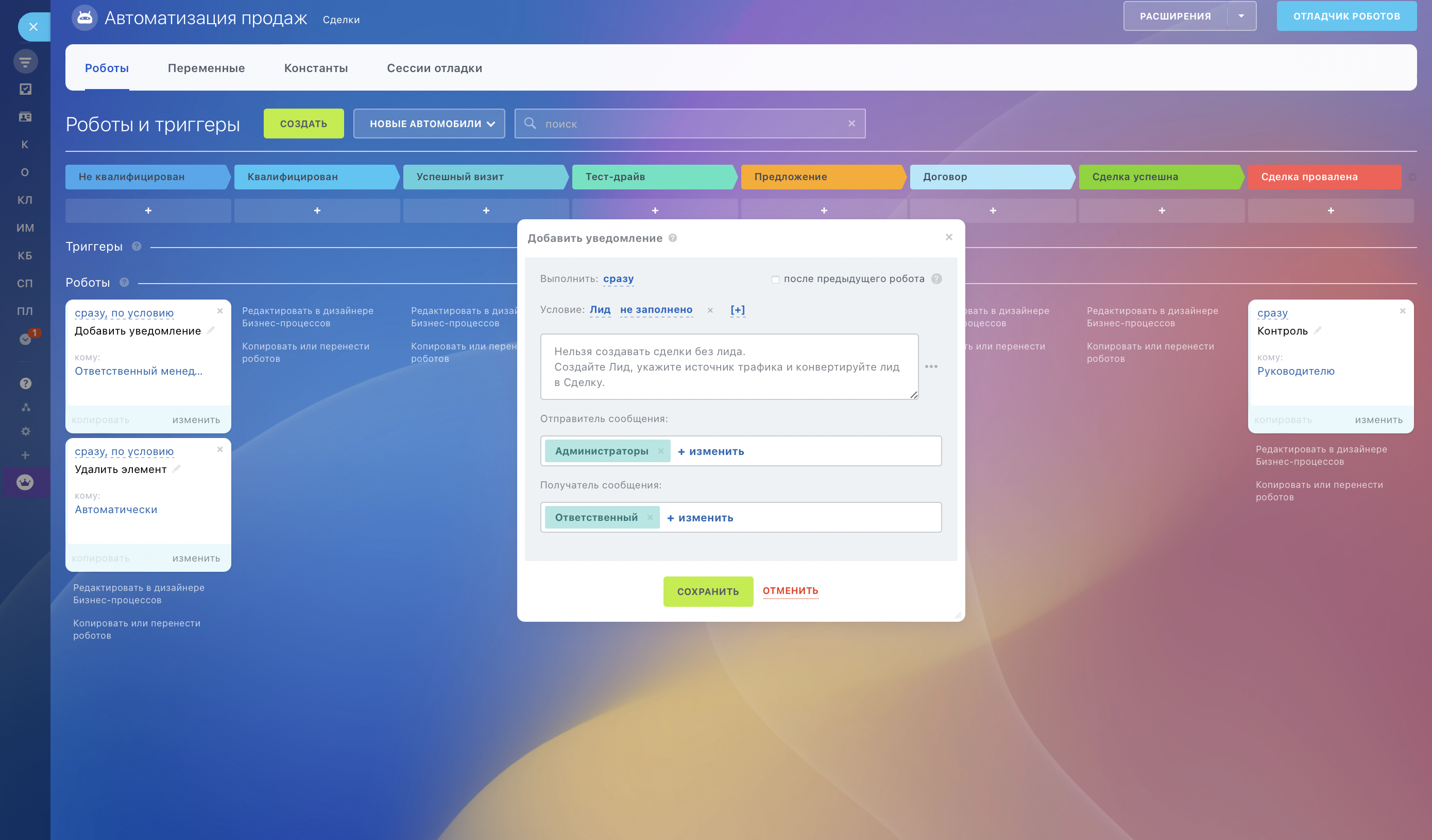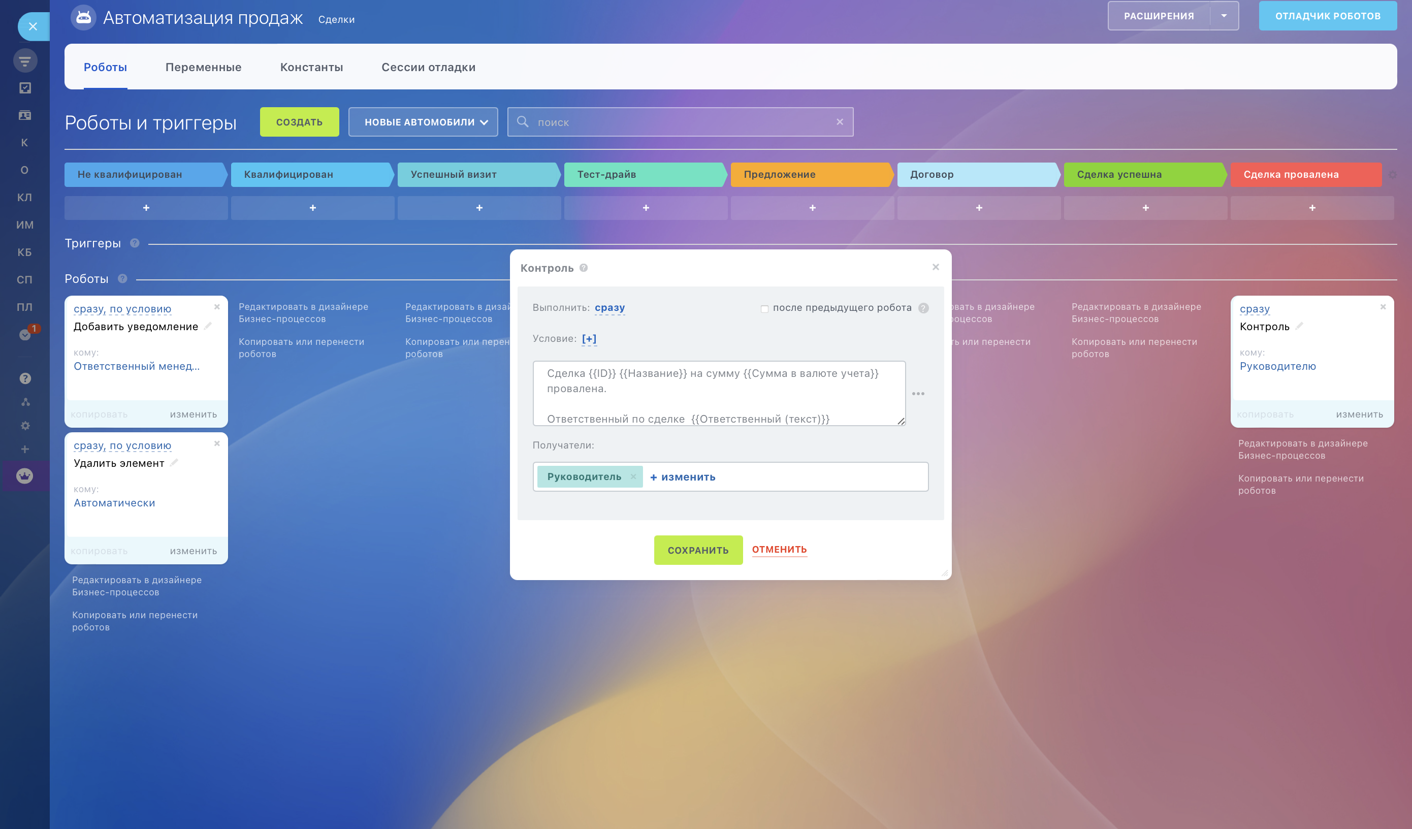 - Сделка провалена - на данной стадии работает робот уведомлений для руководителя, который сообщит, что менеджером провалена сделка на n-сумму