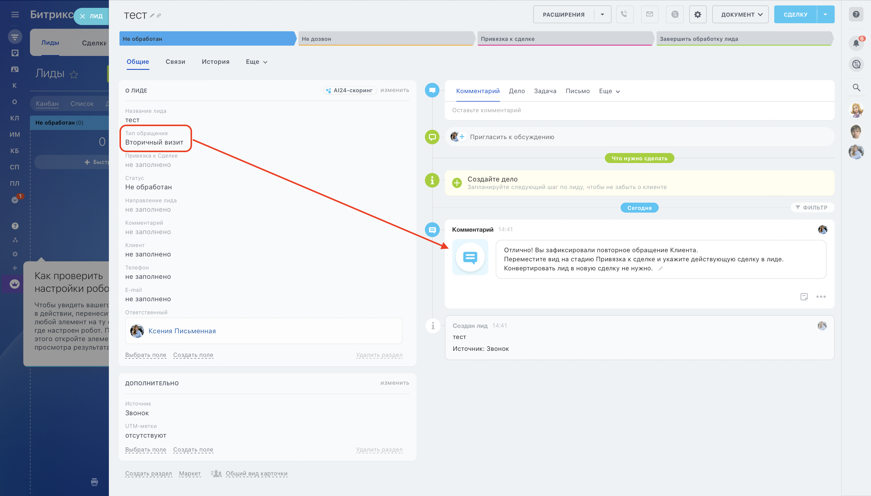 Привязка к сделке – этап для повторных лидов; важно учитывать вторичные обращения для того, чтоб не искажать статистику по эффективности маркетинговых активностей и коверсии отдела продаж из лида в успешные сделки.