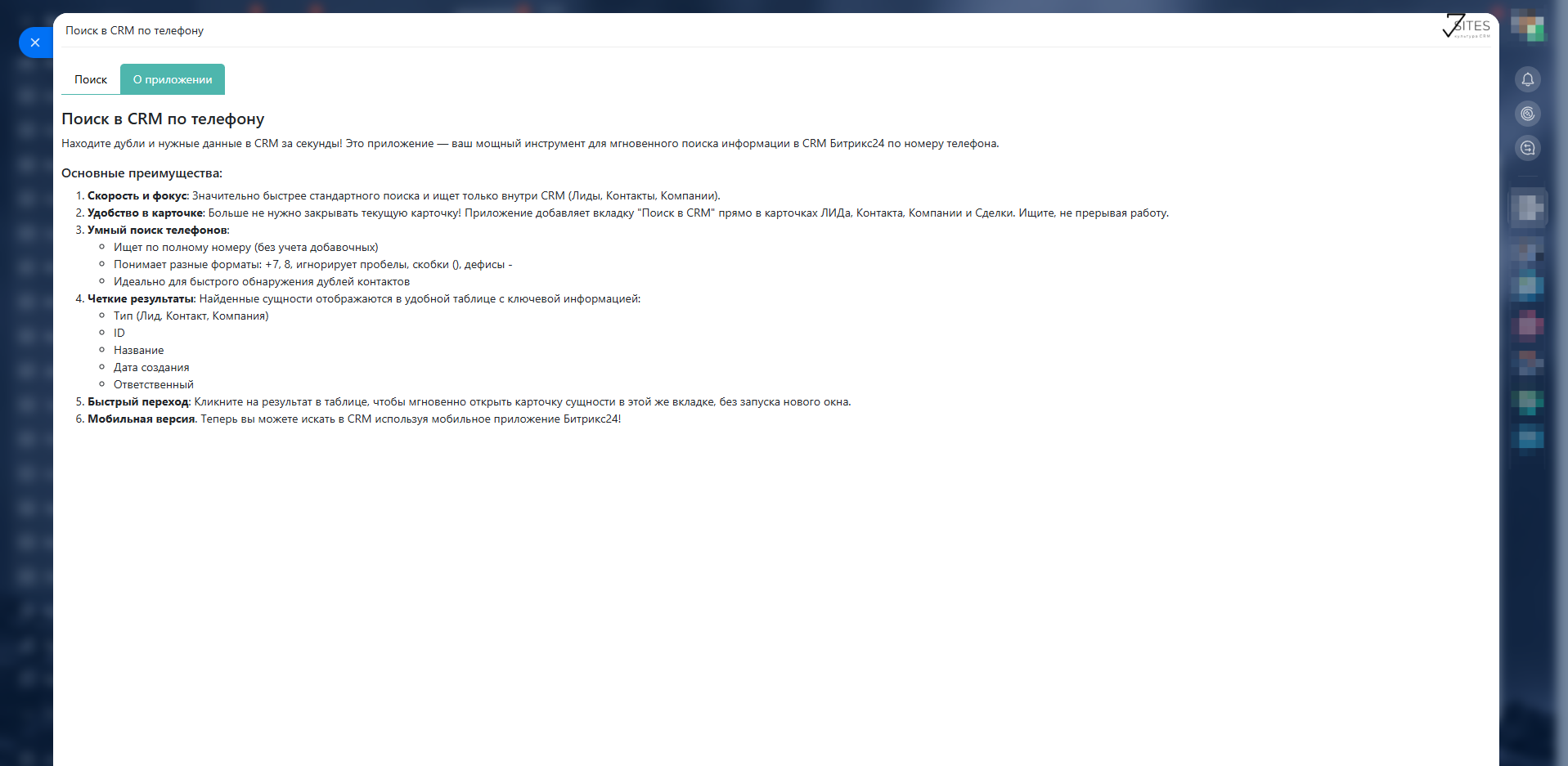 Находите дубли и нужные данные в CRM за секунды! Это приложение — ваш мощный инструмент для мгновенного поиска информации в CRM Битрикс24 по номеру телефона.