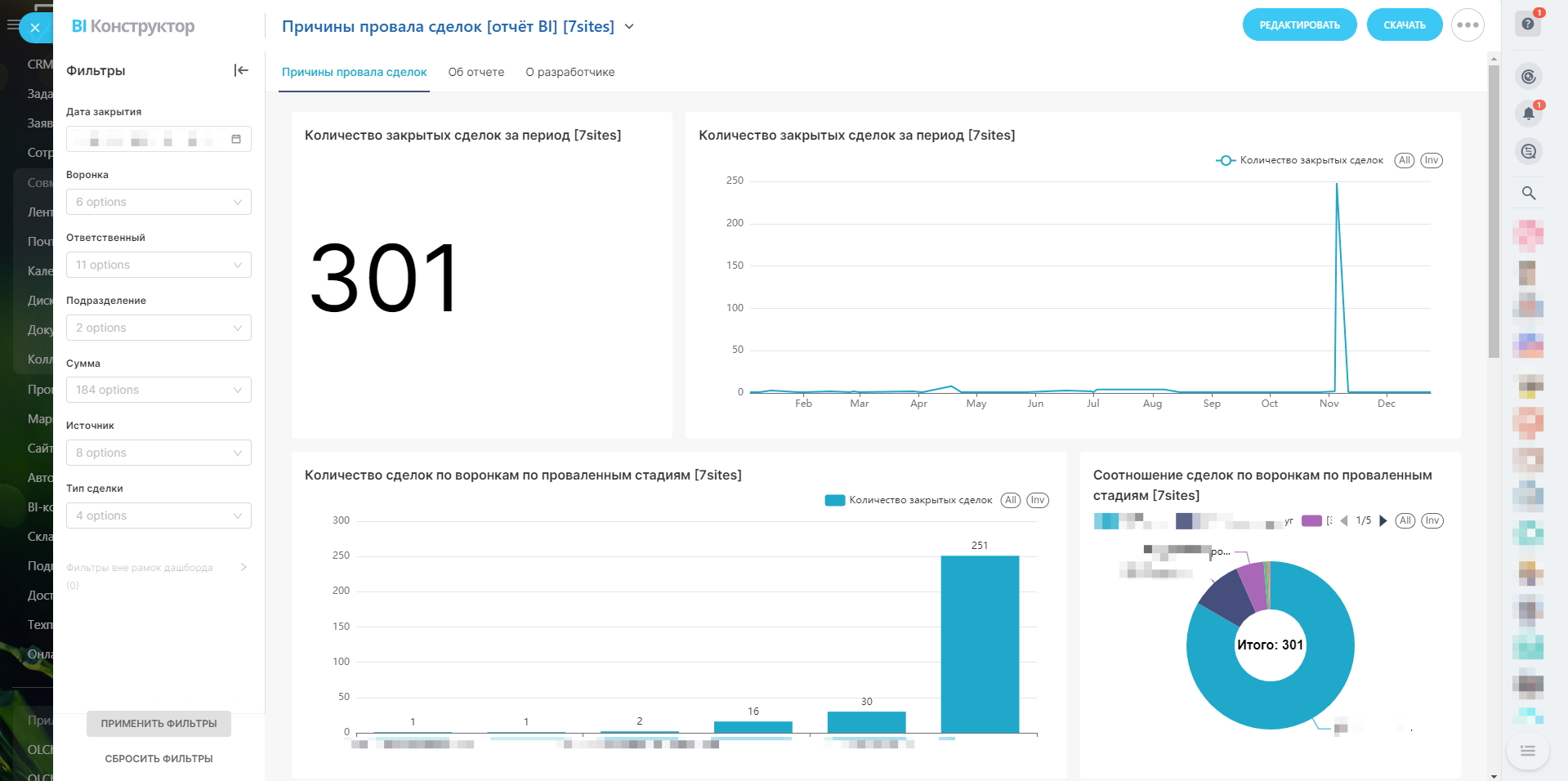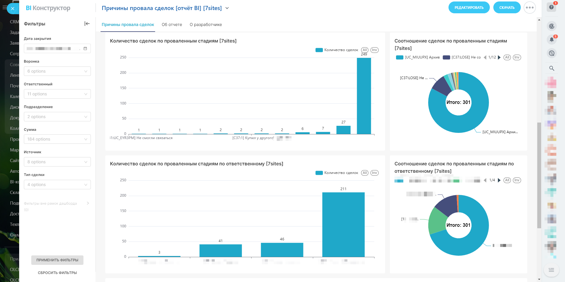Анализ сделок с акцентом на завершённые стадии: на какие именно стадии чаще проваливаются сделки и кто ответственный за эти сделки.