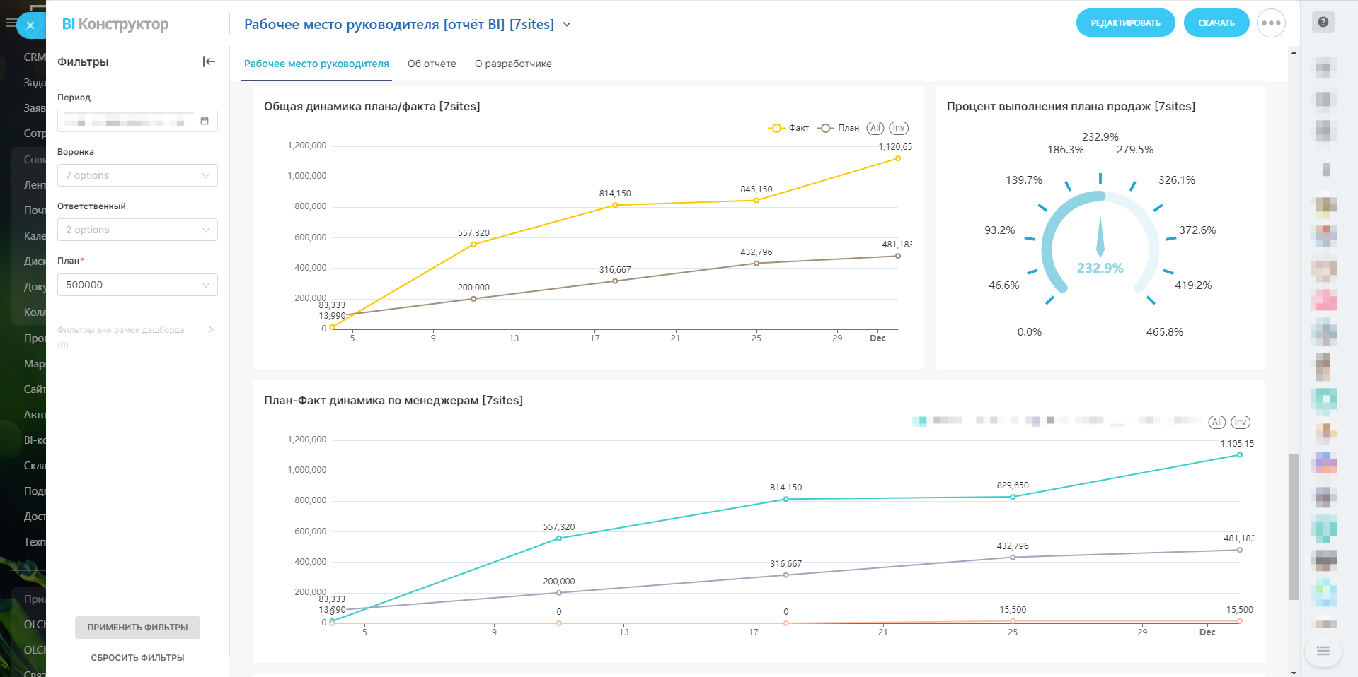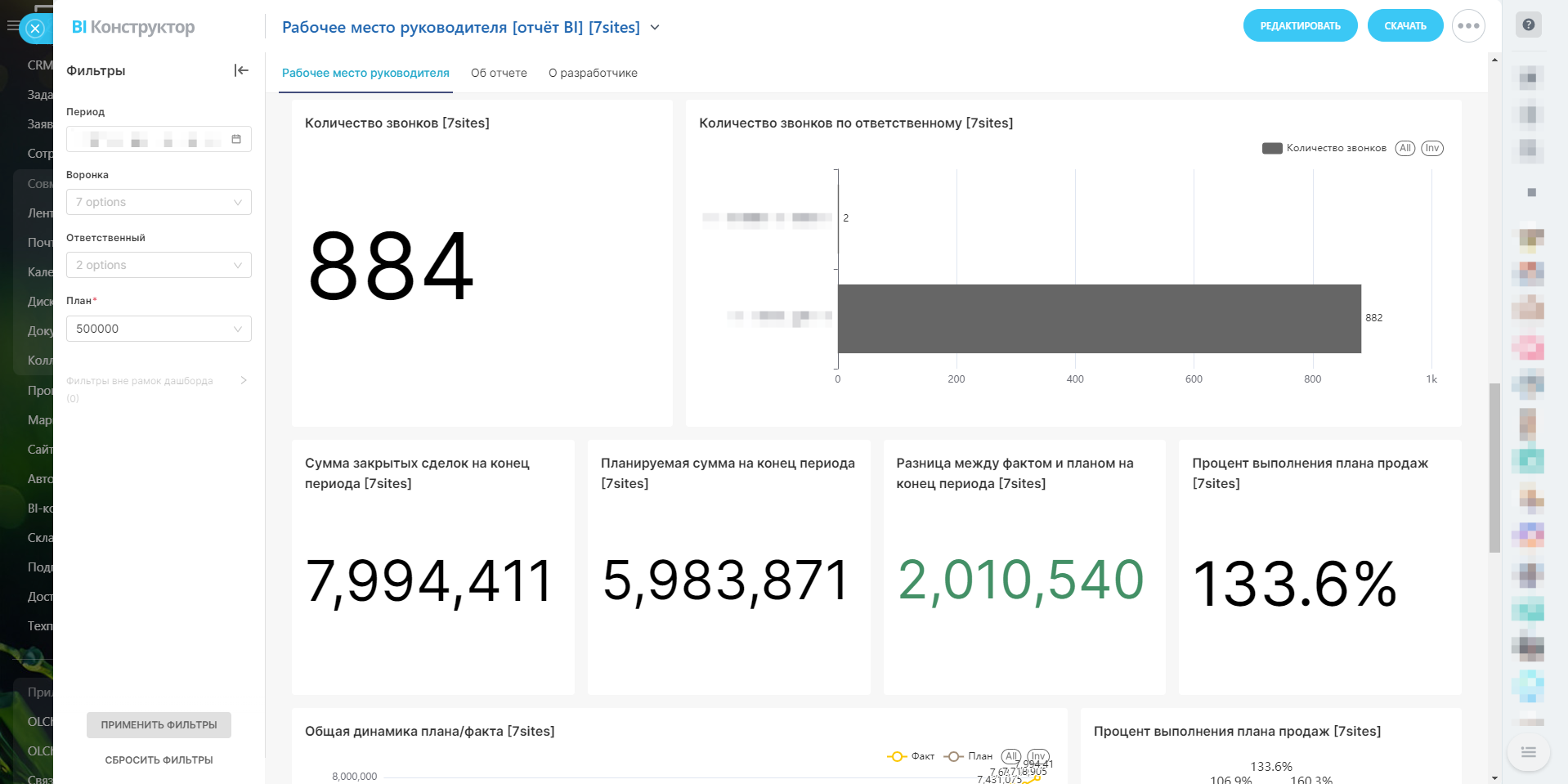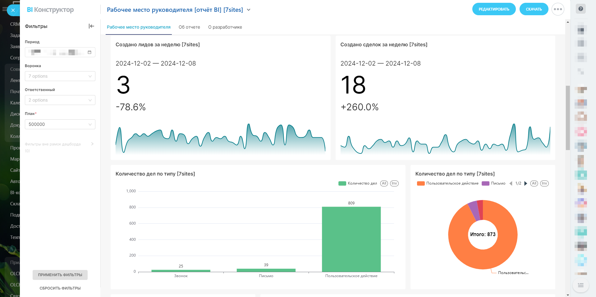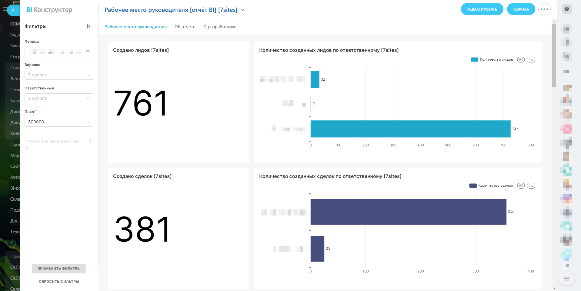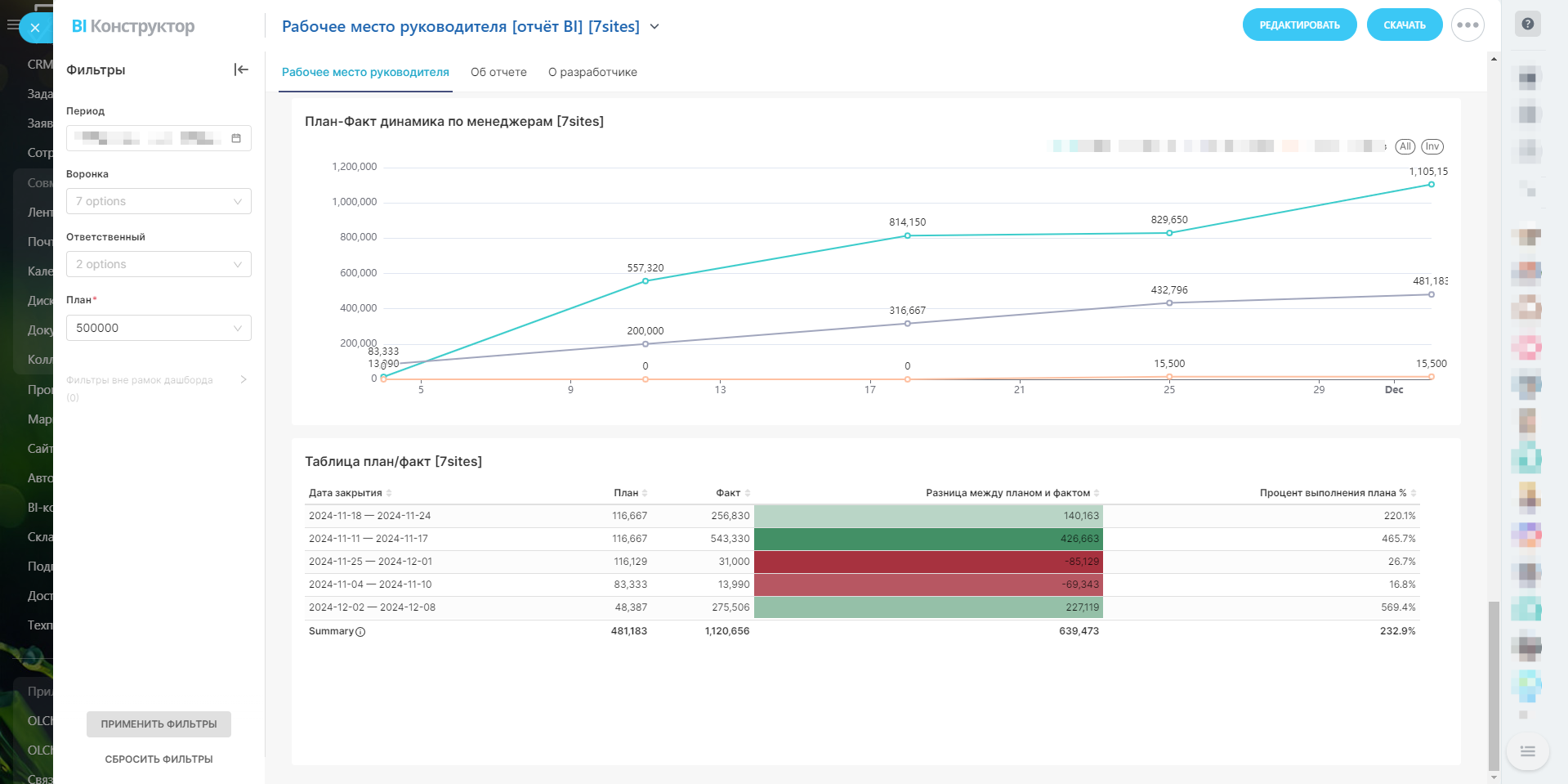 - Ответственный: Фильтрация по менеджерам помогает оценить производительность каждого из них.