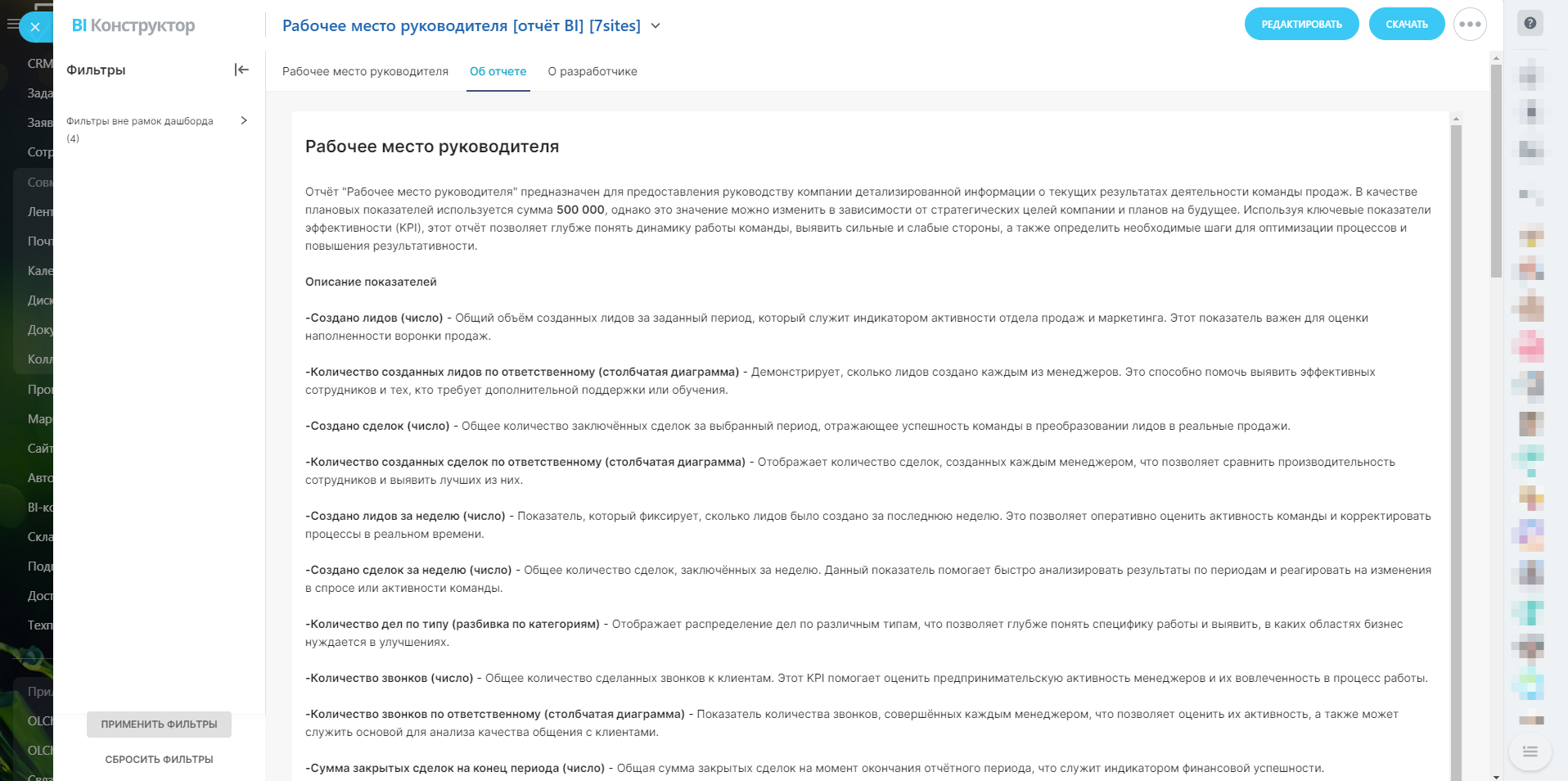 В итоге, отчёт "Рабочее место руководителя" станет мощным инструментом для анализа и оптимизации процессов продаж, а также обеспечения более эффективного управления командой.