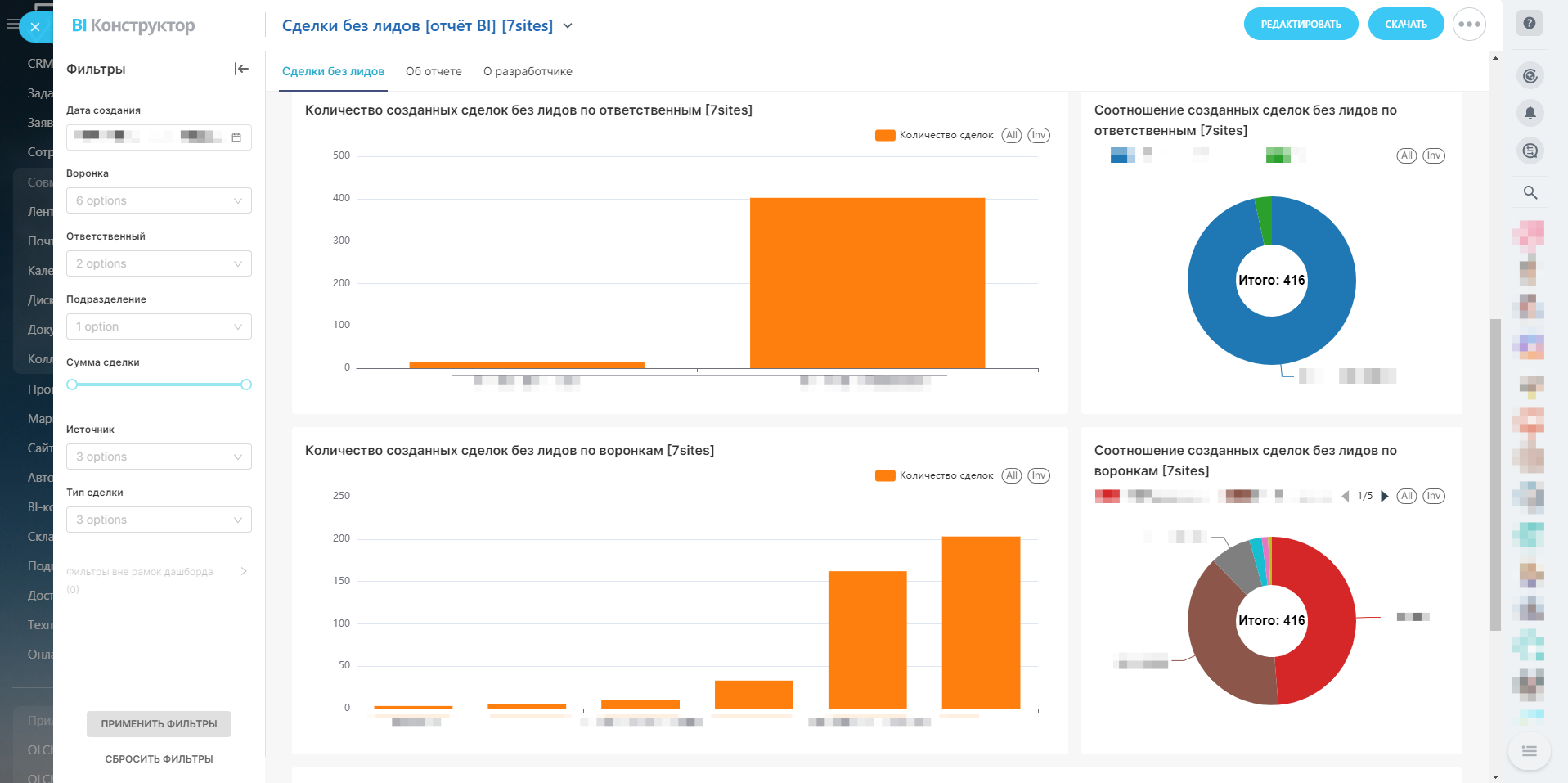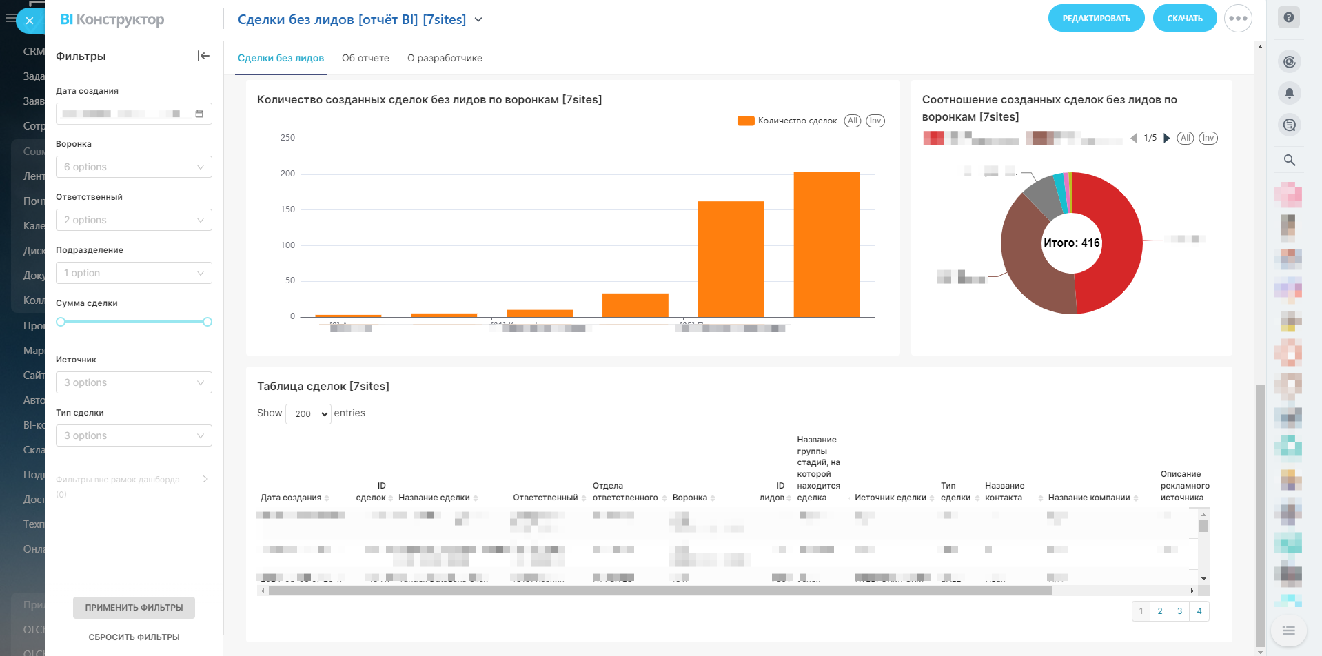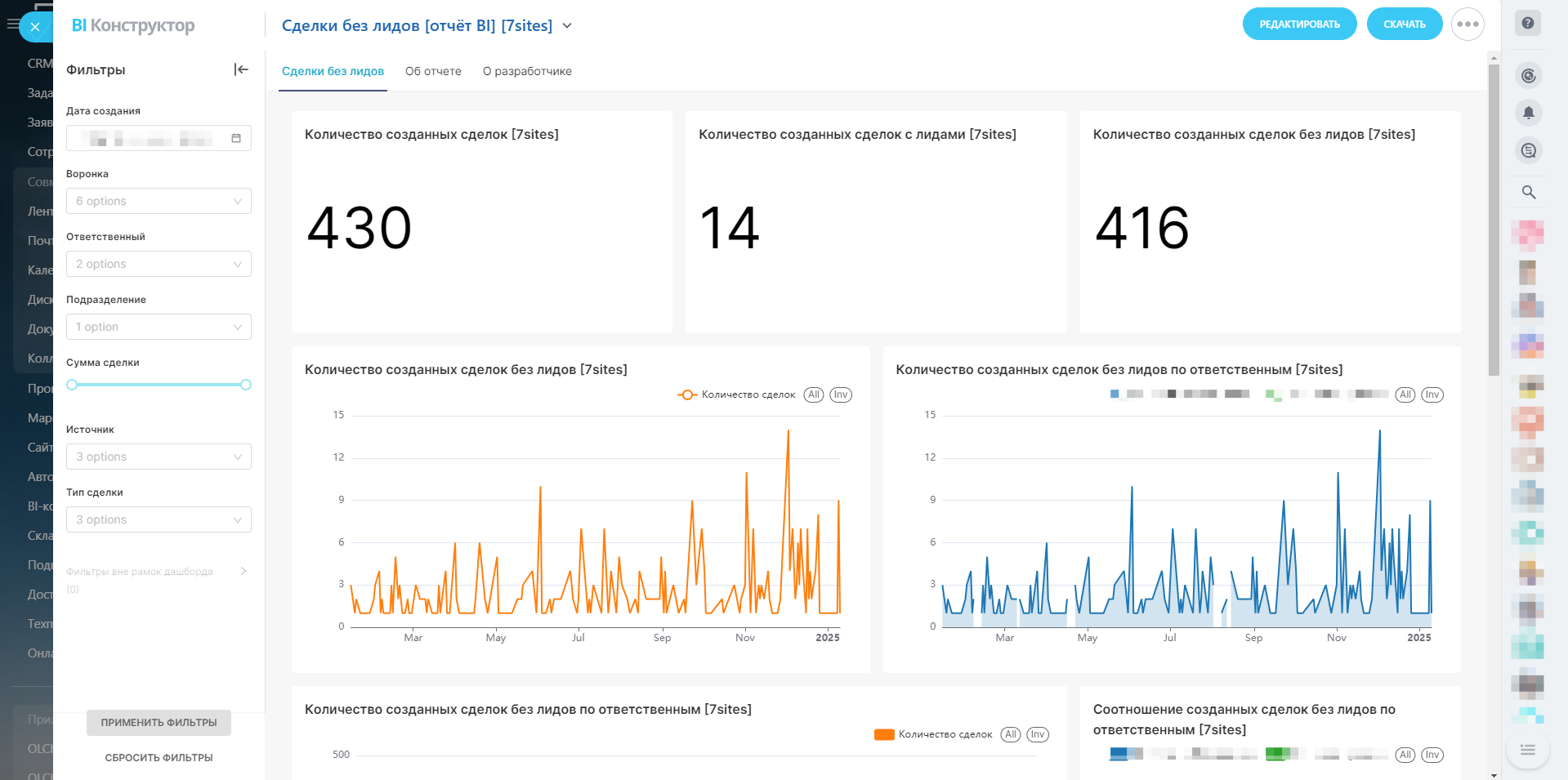 Отчёт "Сделки без лидов" предоставляет анализ данных из таблицы crm_deal, с использованием различных фильтров, чтобы оценить состояние сделок с акцентом на те, которые были созданы без привязки к лидам. В отчёте используются фильтры по дате создания сделок, категориям воронок, ответственным за сделки, подразделениям, суммам, источникам и типам сделок. Основные показатели включают общее количество созданных сделок, количество сделок с лидами, и количество сделок без лидов, что также представлено в виде наглядного графика. Дополнительно рассматриваются сделки без лидов в разрезе ответственных сотрудников и категорий воронок, в заключение, данные подаются в виде таблицы для более детального анализа и сравнений.