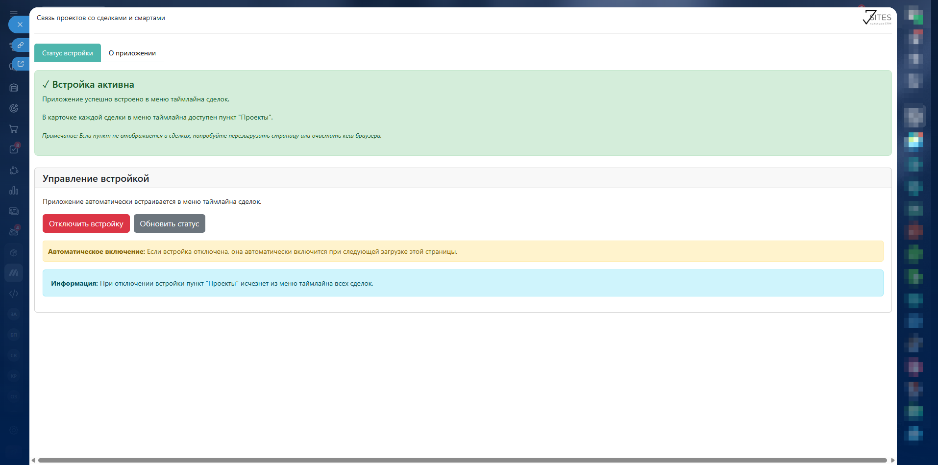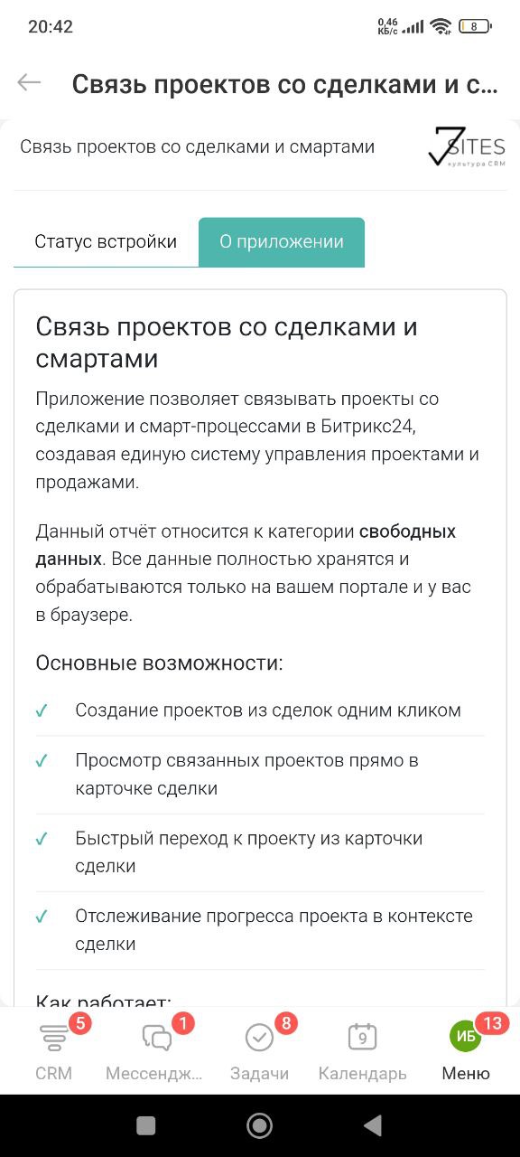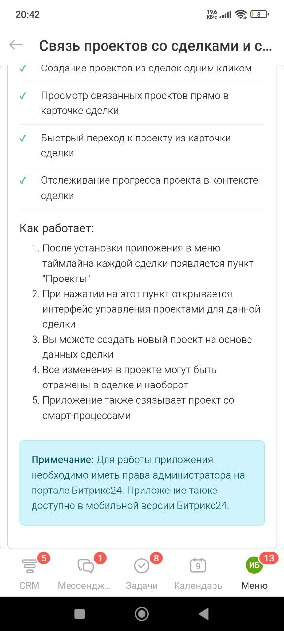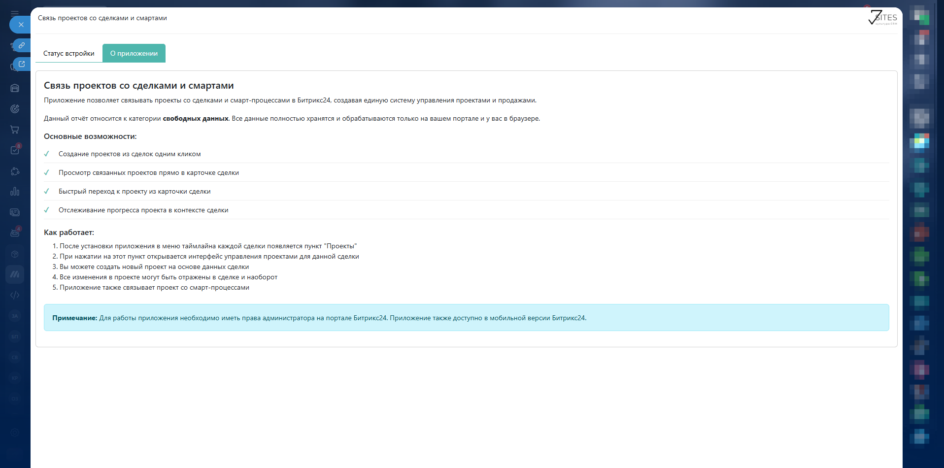 Приложение позволяет связывать проекты со сделками и смарт-процессами в Битрикс24, создавая единую систему управления проектами и продажами.
