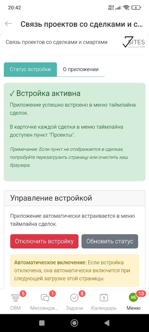 1. После установки приложения в меню таймлайна каждой сделки появляется пункт "Проекты"