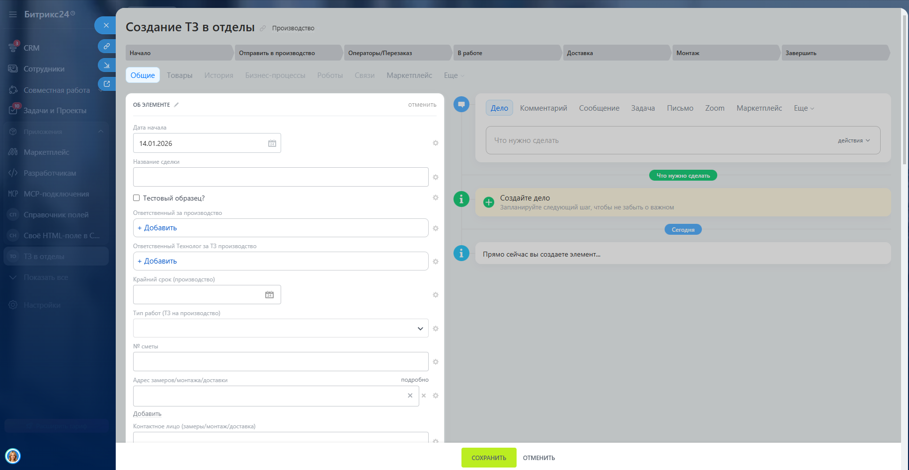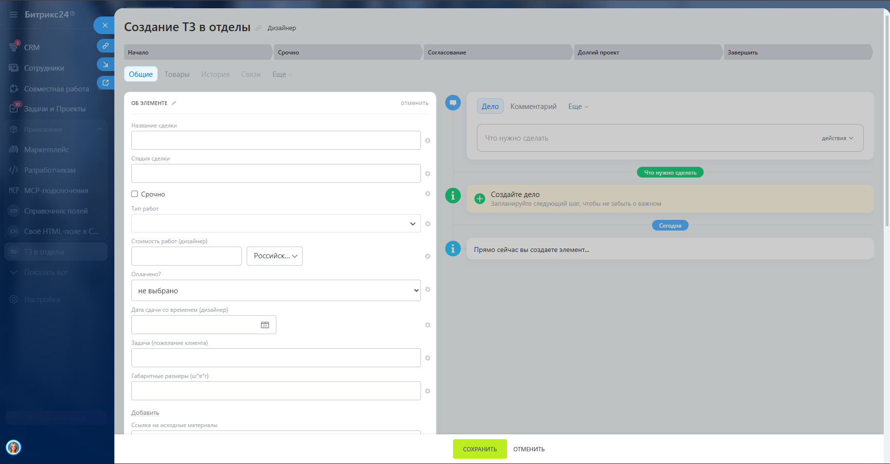 Каждый заказ или задача — это умная карточка («ТЗ в отделы»), которая автоматически передаётся из воронки в воронку. В карточке хранится всё: техническое задание, референсы, файлы, сроки, комментарии, итоговые артикулы и чертежи. Вся история обсуждений и согласований остаётся в одном месте.