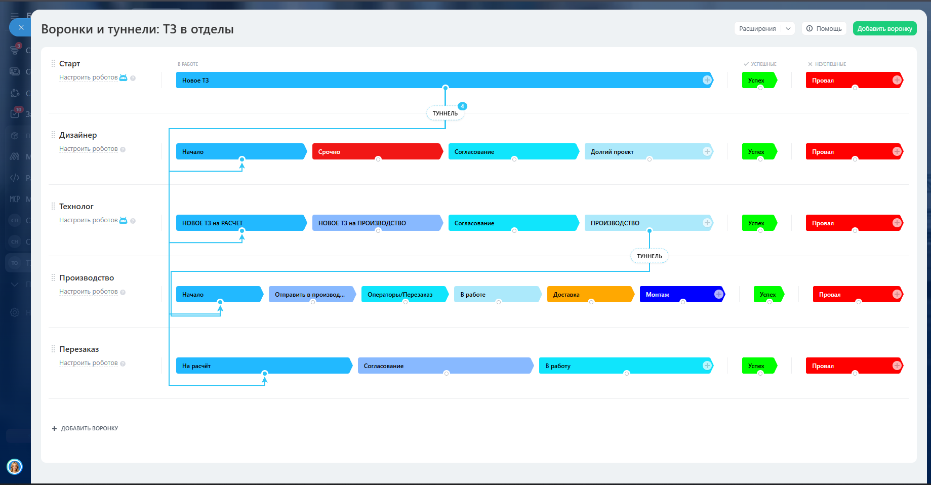 Система — это четыре связанных между собой «маршрута» (воронки) для разных отделов: