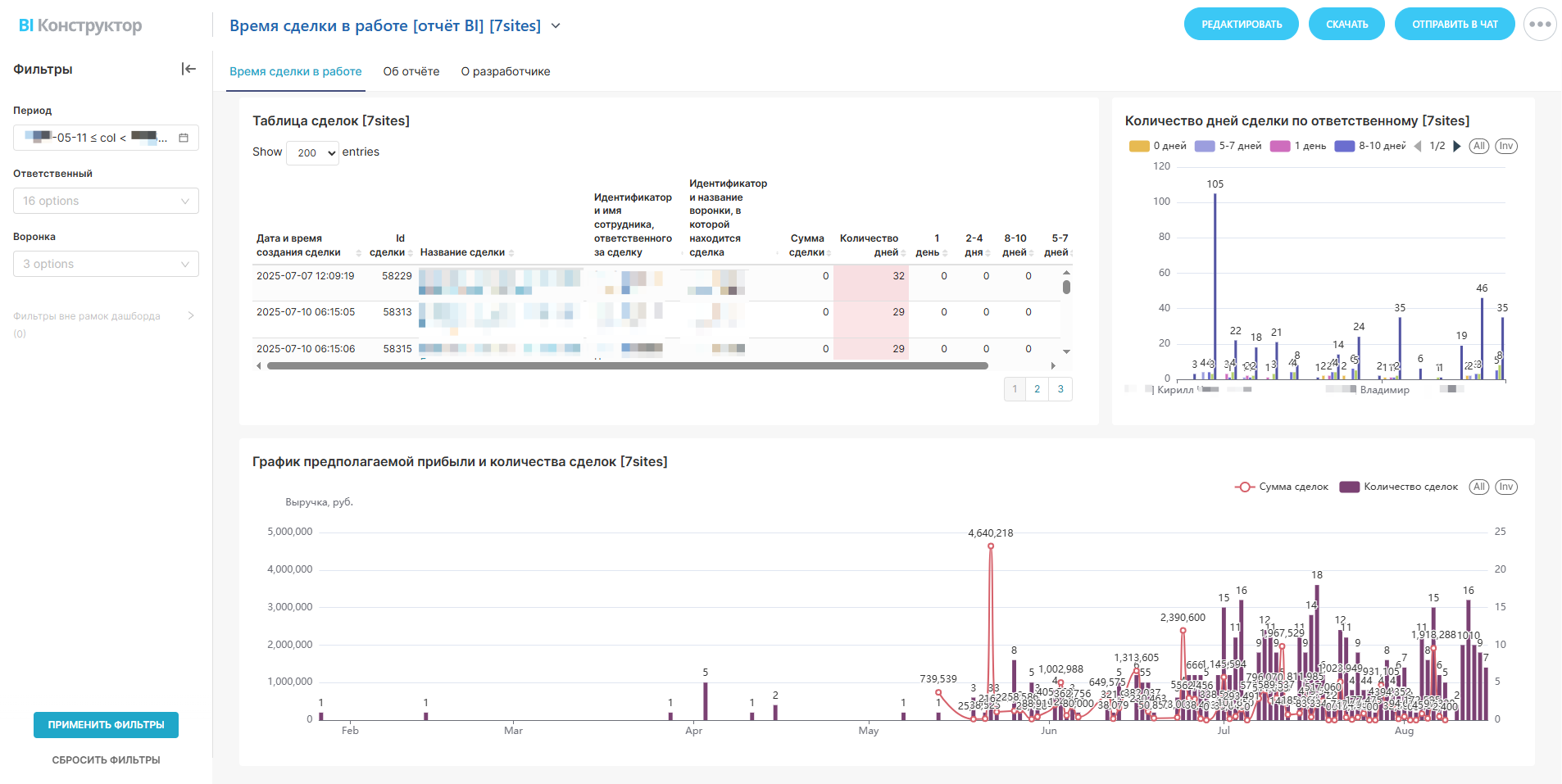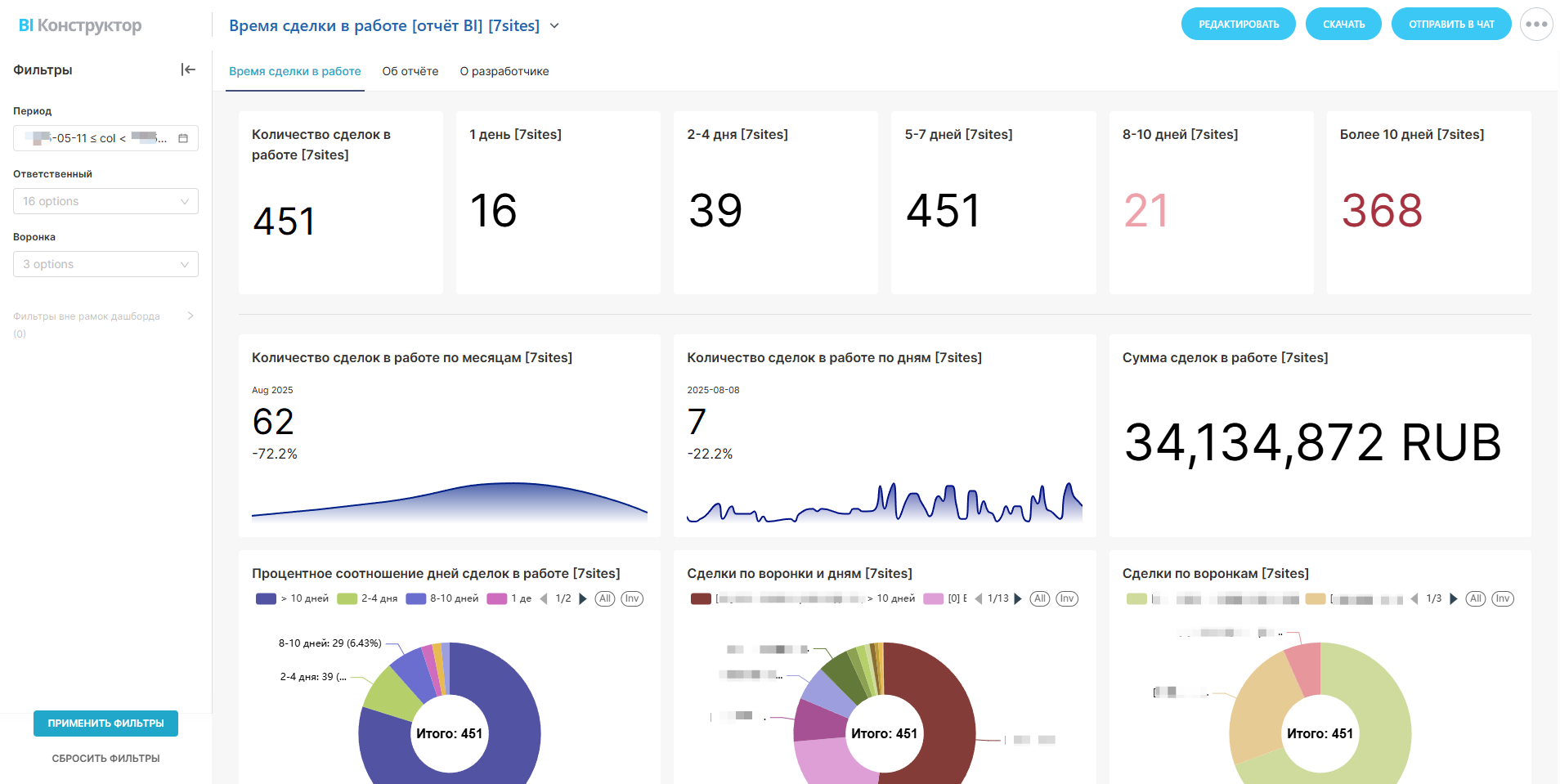 Сделки по воронке и дням: Показывает распределение сделок по этапам воронки продаж с учетом времени их нахождения на каждом этапе. Это позволяет определить, какие этапы являются наиболее длительными и требуют оптимизации.