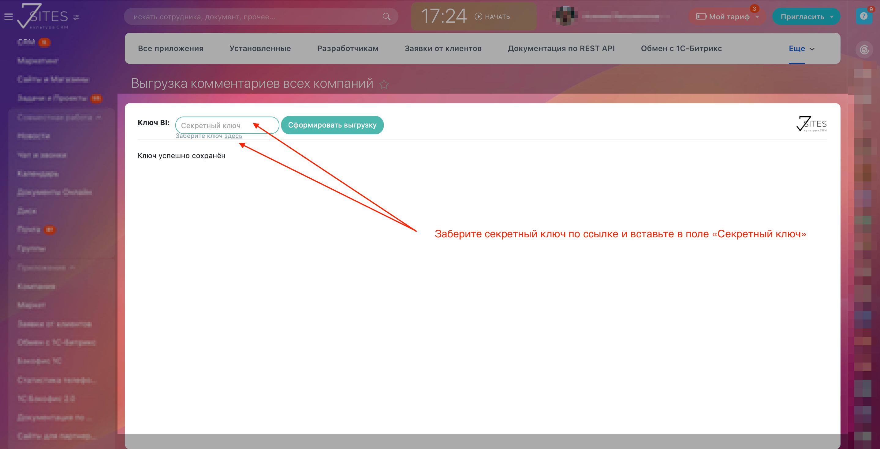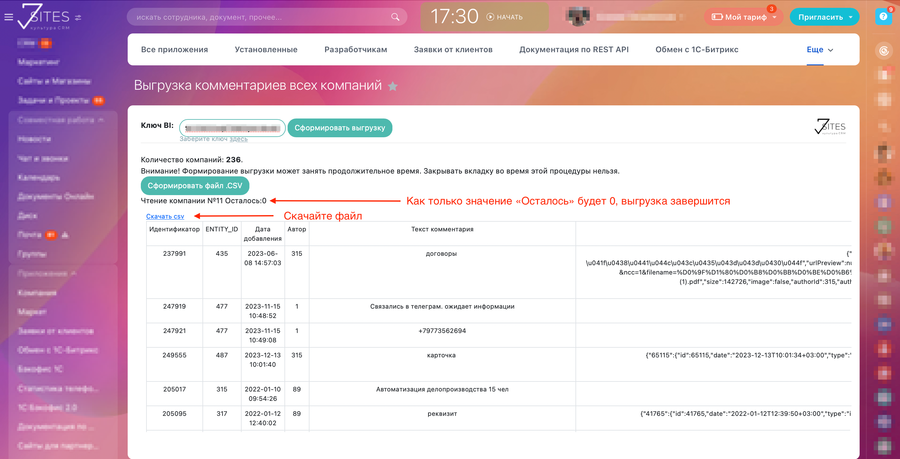 После установки приложения в карточке сделки появляется удобная кнопка "Сформировать выгрузку". Просто нажмите на нее, и откроется таблица с полями комментариев. Для сохранения данных в Excel просто кликните на ссылку "Сформировать файл .CSV".