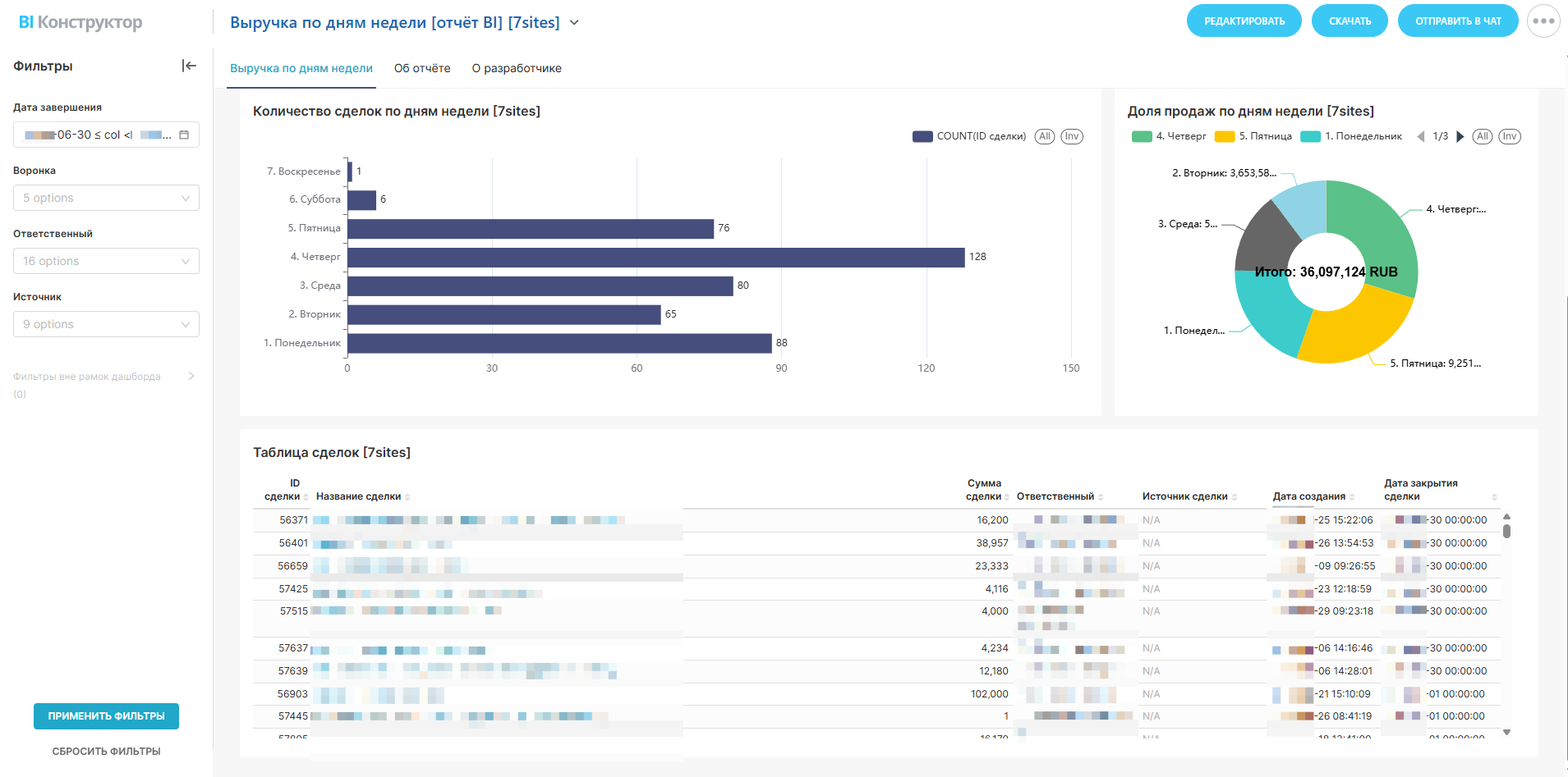 3. Полная детализация по сделкам. Не просто цифры, а полная информация: кто из менеджеров звезда четверга, а кто эффективнее всего работает в понедельник? Из какой воронки идут самые платёжеспособные клиенты в субботу?