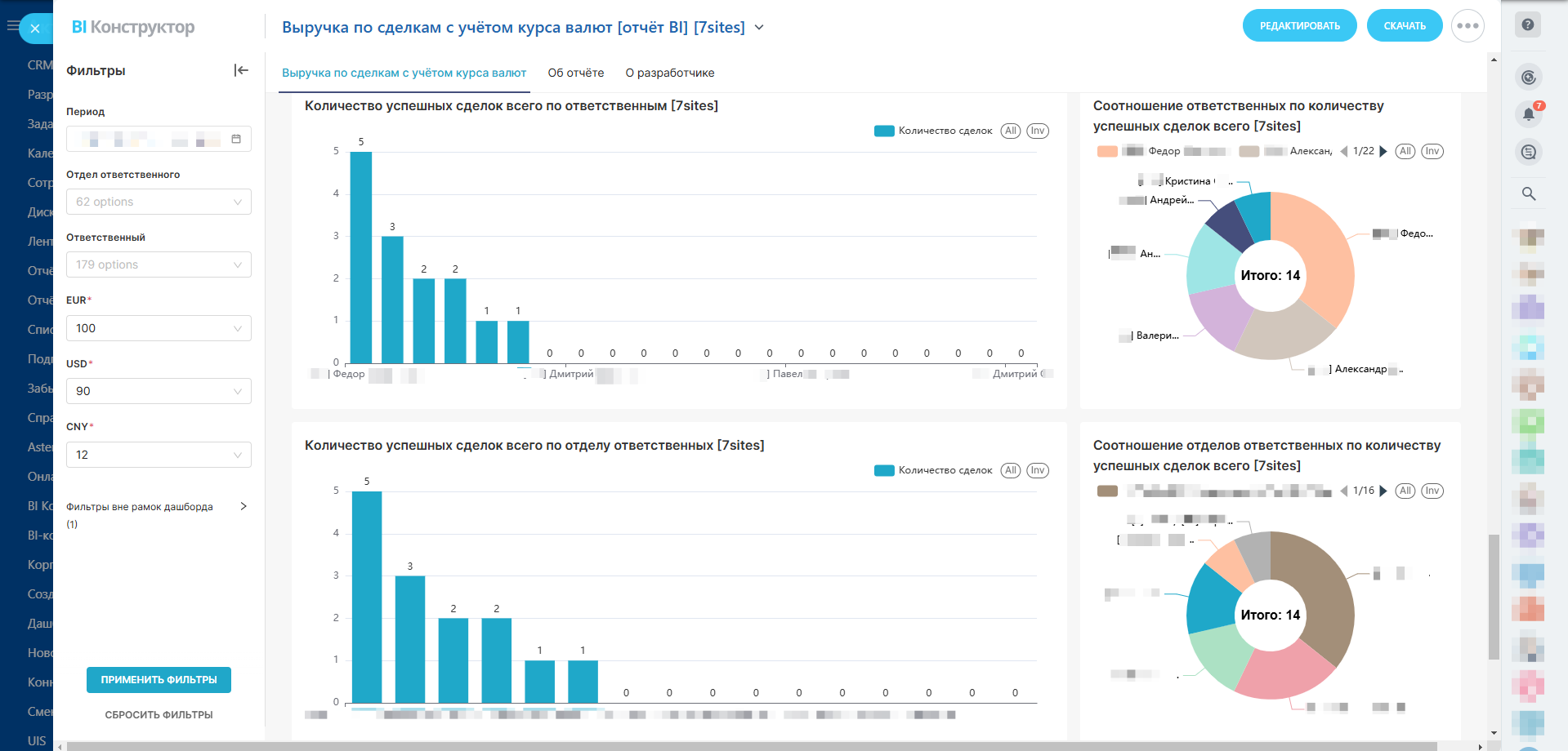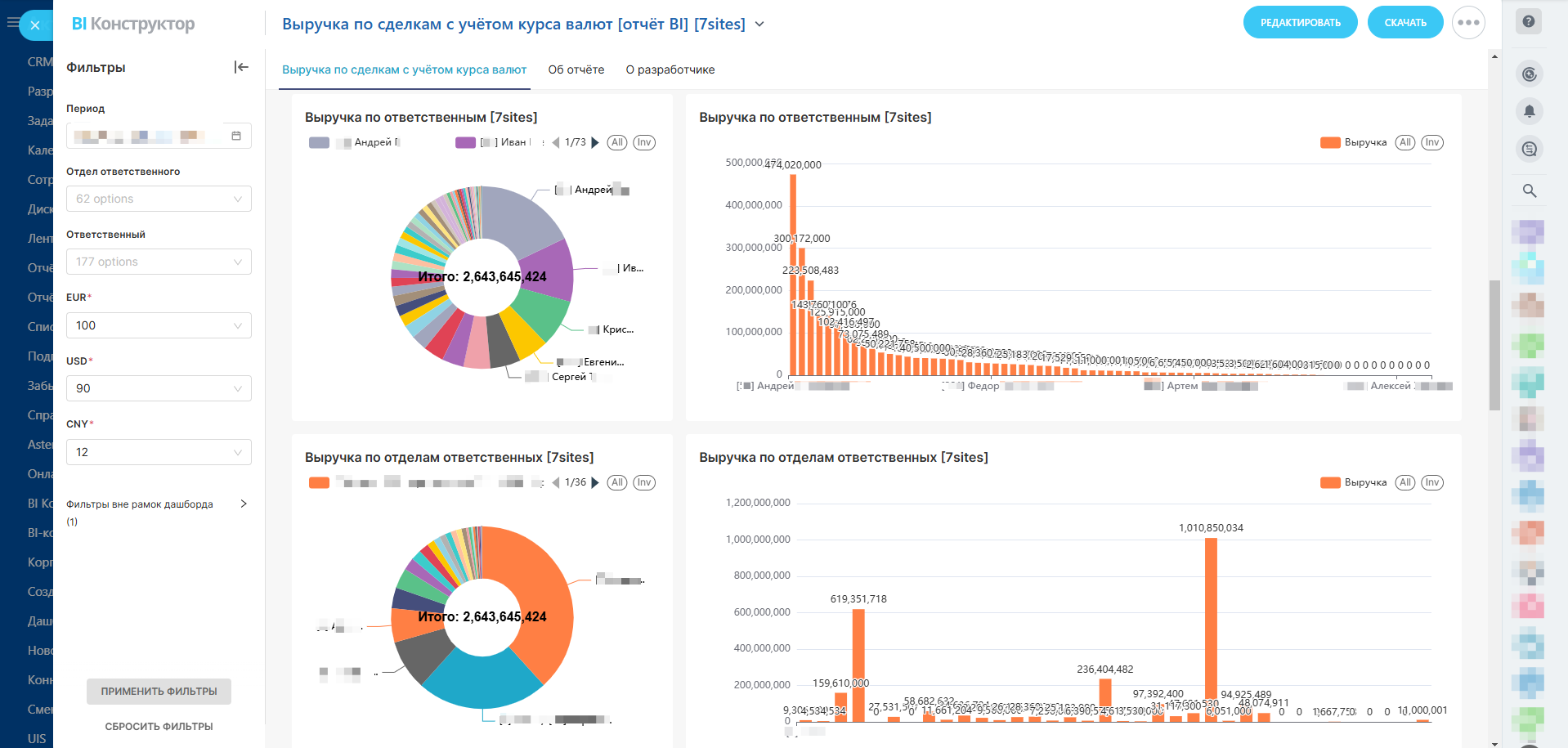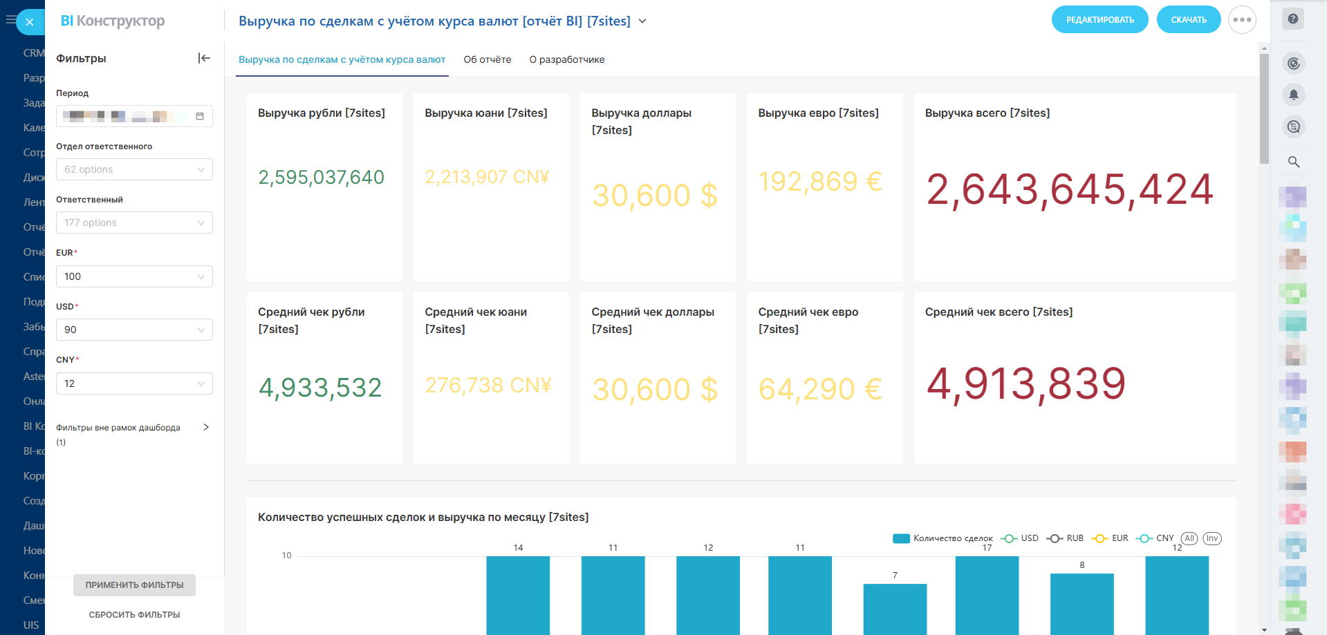 Выручка и средний чек в валютах: рубли, юань, доллар, евро. Для сделок в разных валютах.
