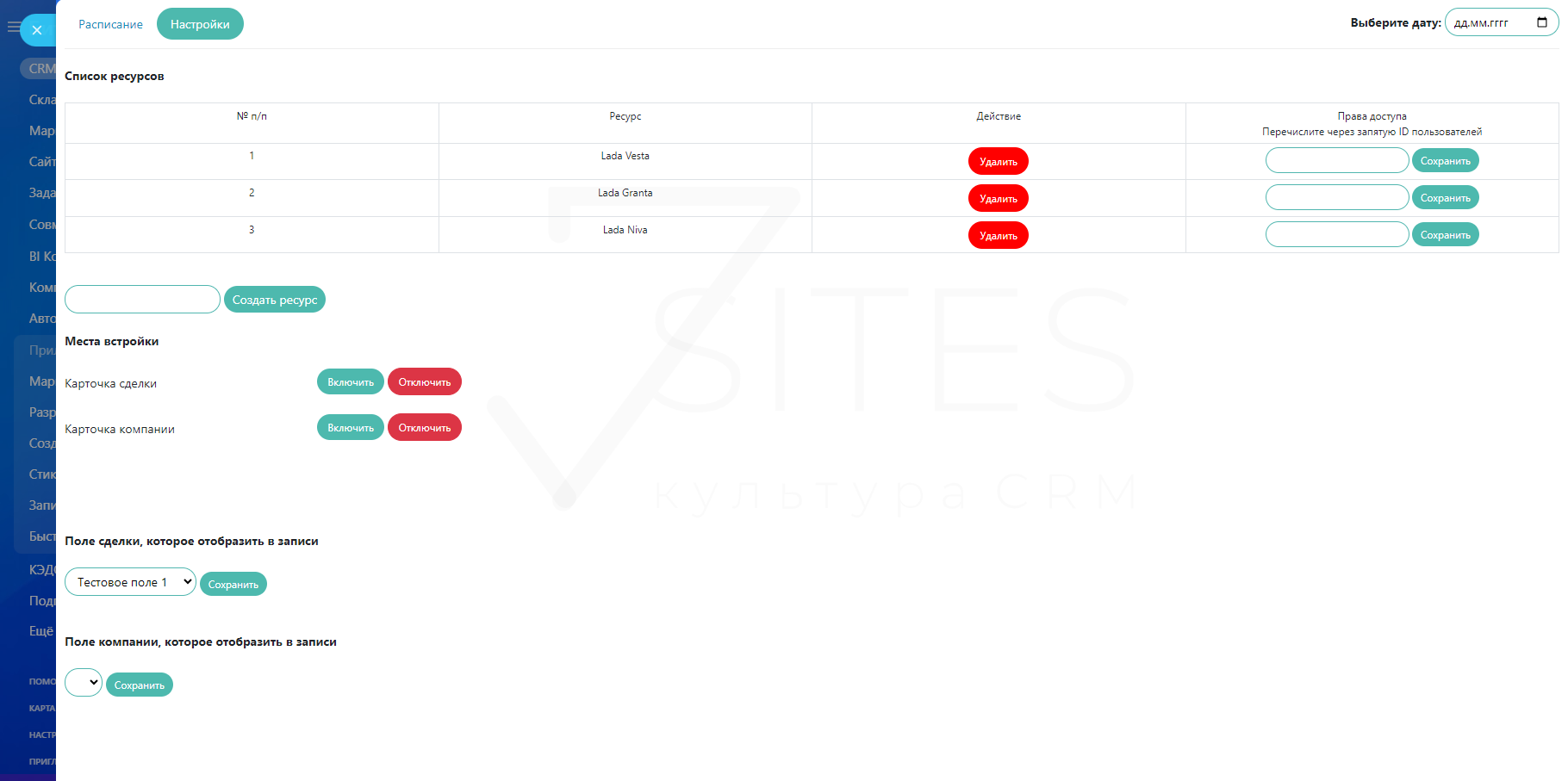 Приложение может встраиваться в карточку Сделки или Компании. В этом случае запись можно производить прямо внутри карточек этих сущностей. При этом, в карточке записи будет отображаться ссылка на привязанную сущность.
