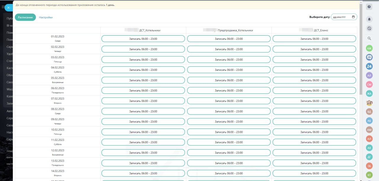 Приложение позволяет создавать календарь загрузки для неограниченного количества ресурсов, как для нескольких постов одного автосервиса, так и для нескольких филиалов/юридических лиц.