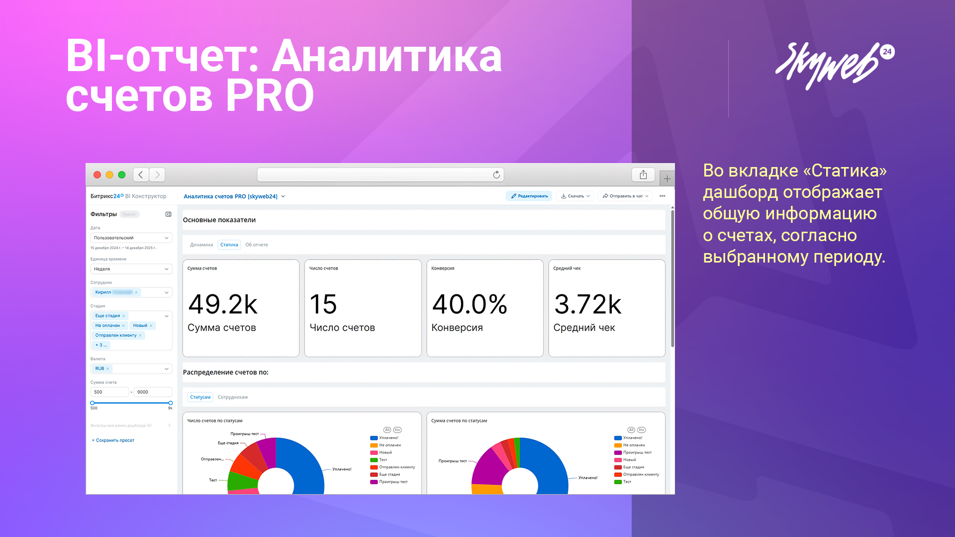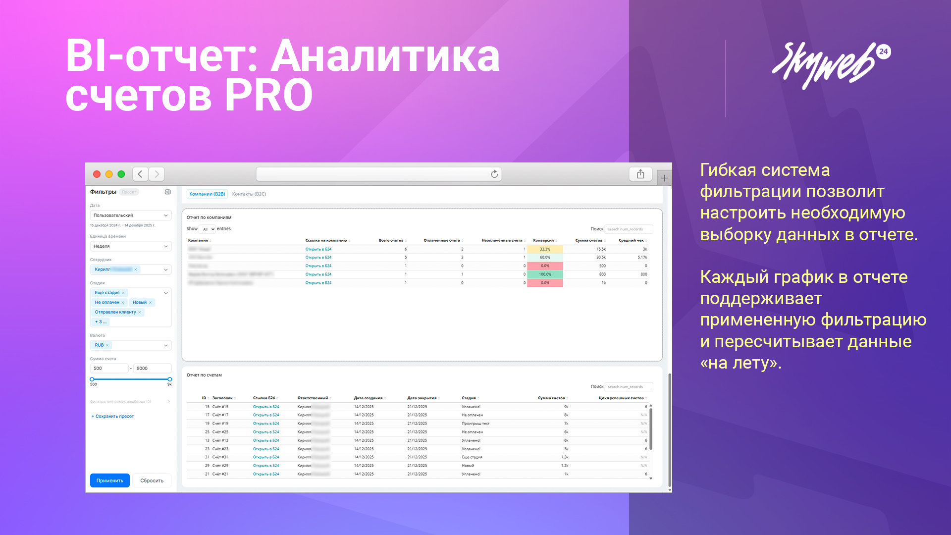 • Умные фильтры: настройка по дате, сотруднику, стадии, валюте и сумме счетов.