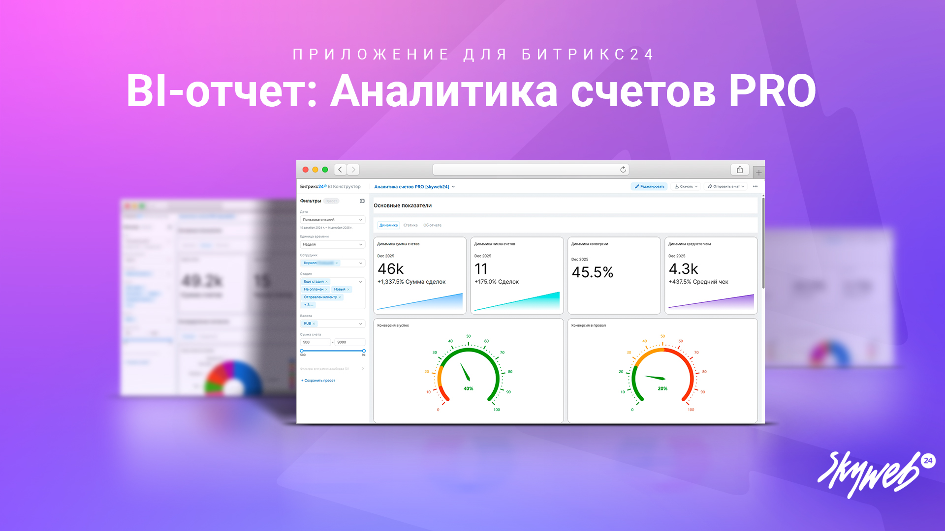 • Дашборд продаж: сумма счетов, их количество, конверсия и средний чек.