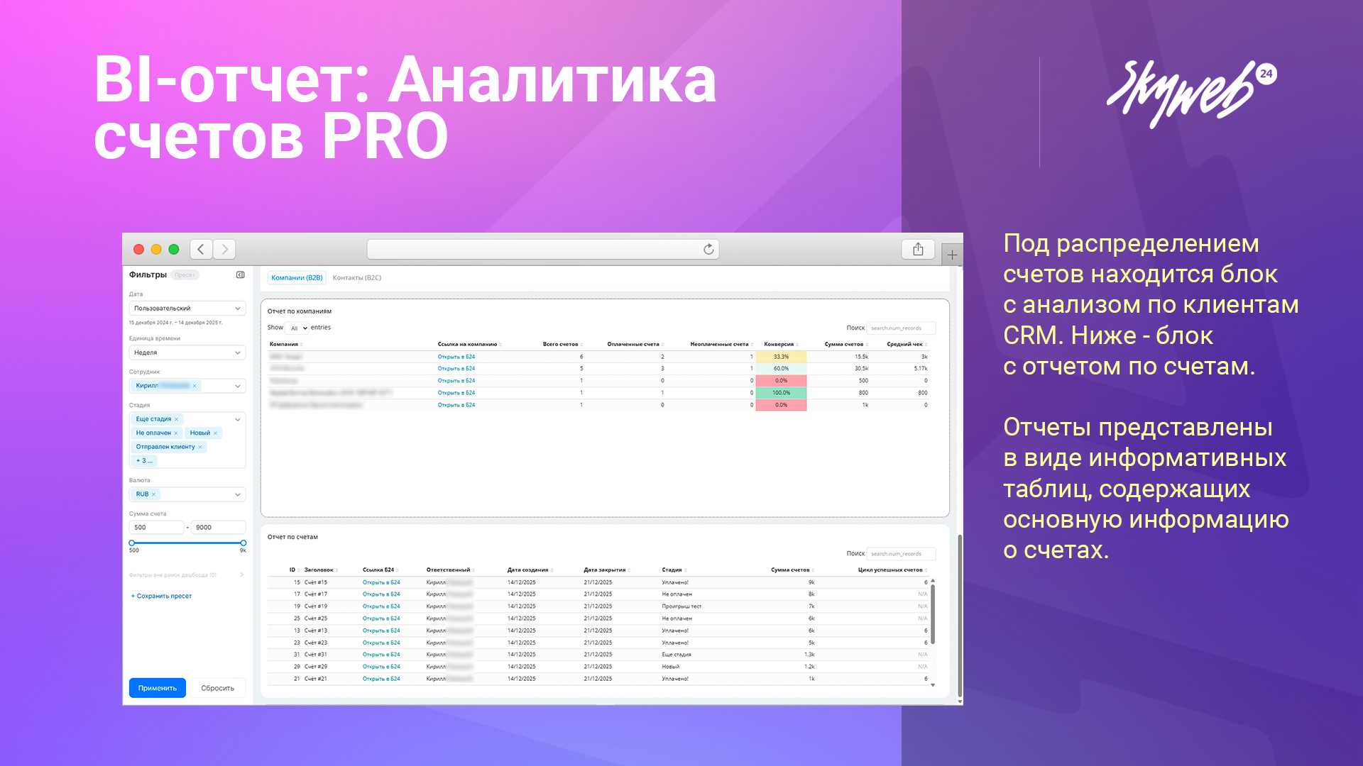 • Детальные таблицы: быстрый доступ к информации по каждому счету, включая даты создания и закрытия, стадию, сумму и цикл успешных сделок.