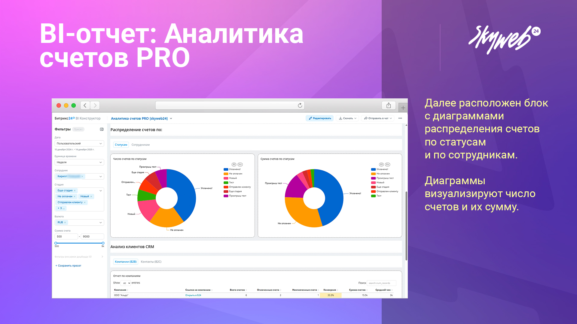 • CRM-аналитика: анализ счетов клиентов (компаний и контактов) с учётом статусов, конверсий и среднего чека.