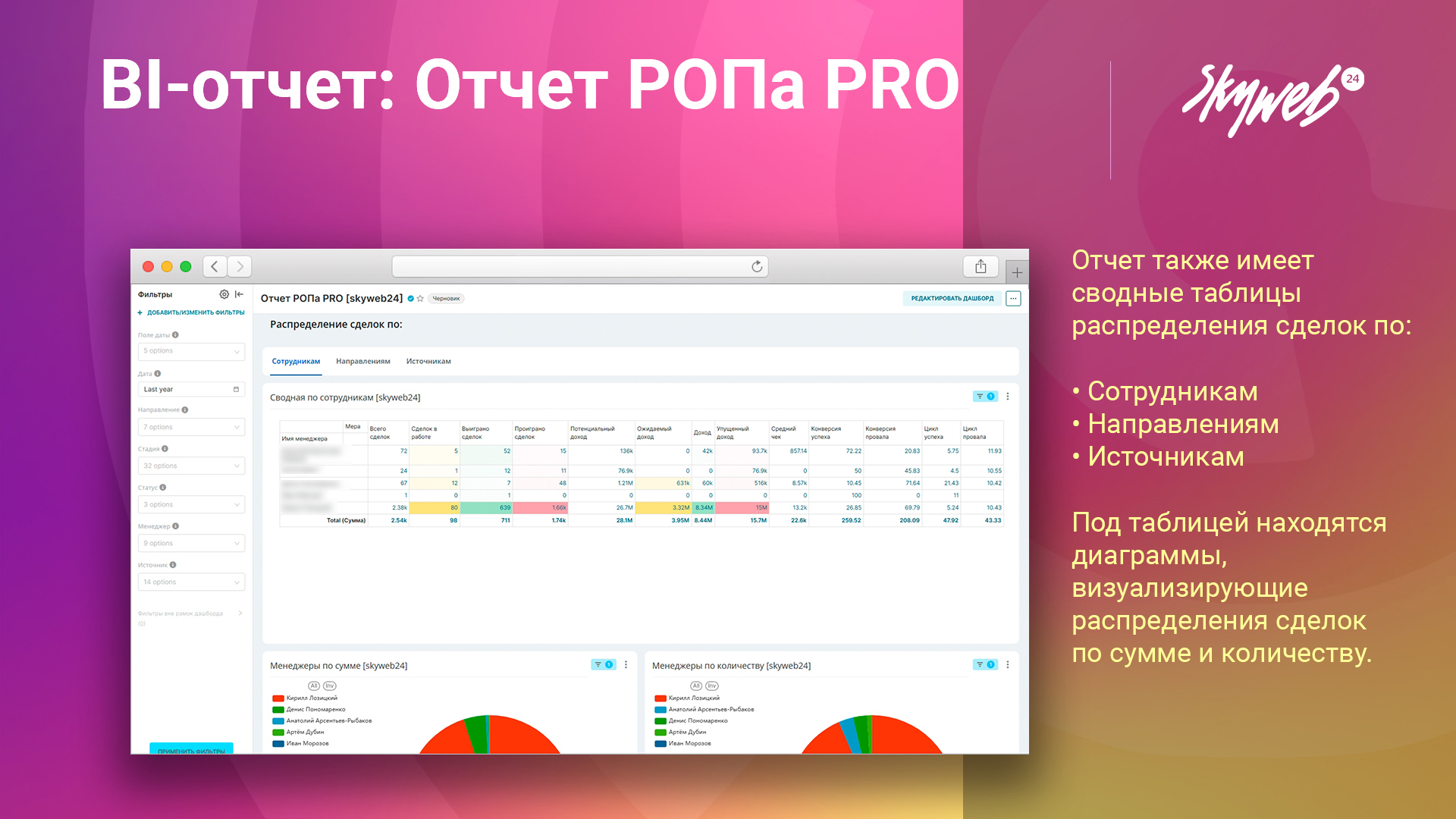 - Распределение сделок по сотрудникам, источникам, направлениям и ТОП-10 менеджеров