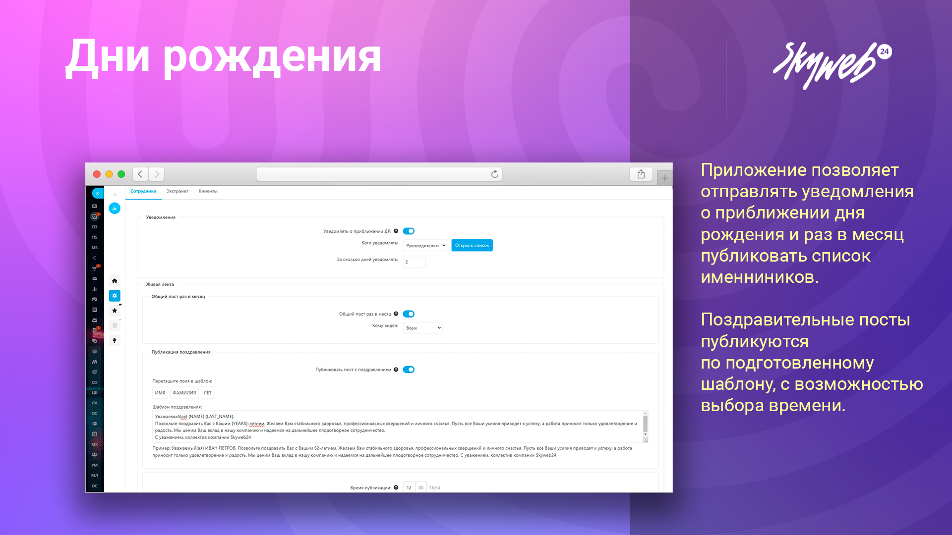 Попробуйте наше приложение от Скайвеб24 уже сегодня и убедитесь, насколько легко отслеживать дни рождения всех пользователей!