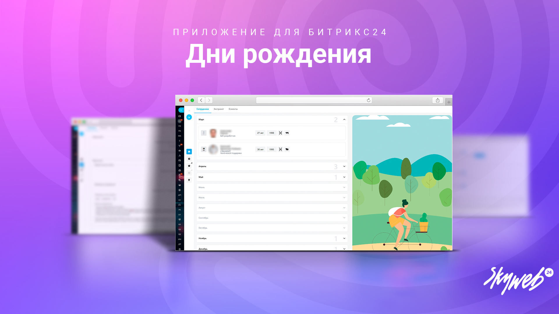 Наше приложение помогает отслеживать дни рождения сотрудников, экстранет-пользователей и клиентов вашей компании.