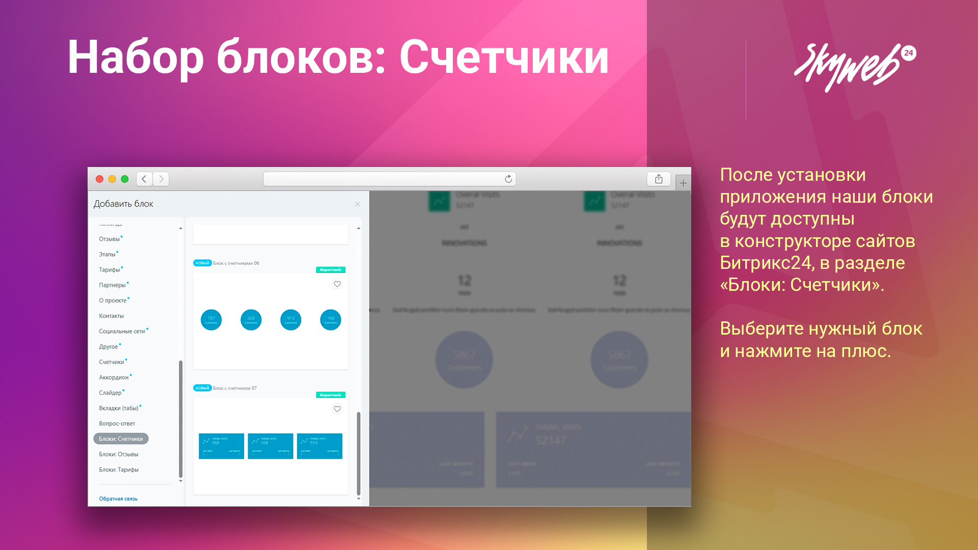 Наше приложение — это набор из 7 готовых блоков-счётчиков для сайтов на Битрикс24, готовых стать частью вашего сайта: