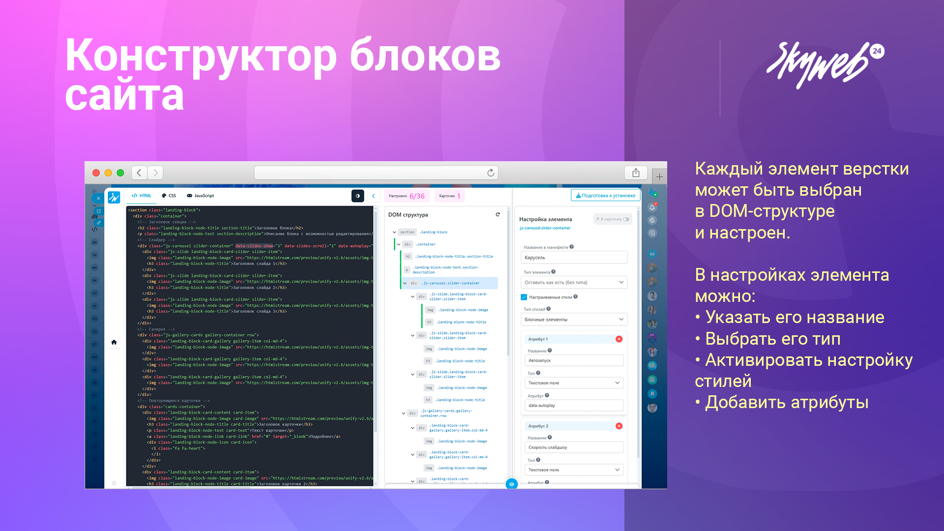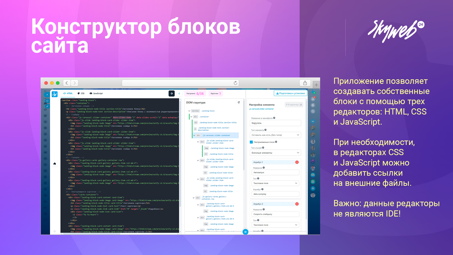 Стандартные блоки Битрикс24 часто ограничивают гибкость дизайна и функционала, мешая реализовать уникальные идеи. Наш конструктор дает свободу — вы сами пишете HTML, CSS и JS, подключаете внешние файлы, настраиваете узлы и управляете стилями. Никаких компромиссов между креативом и реализацией.