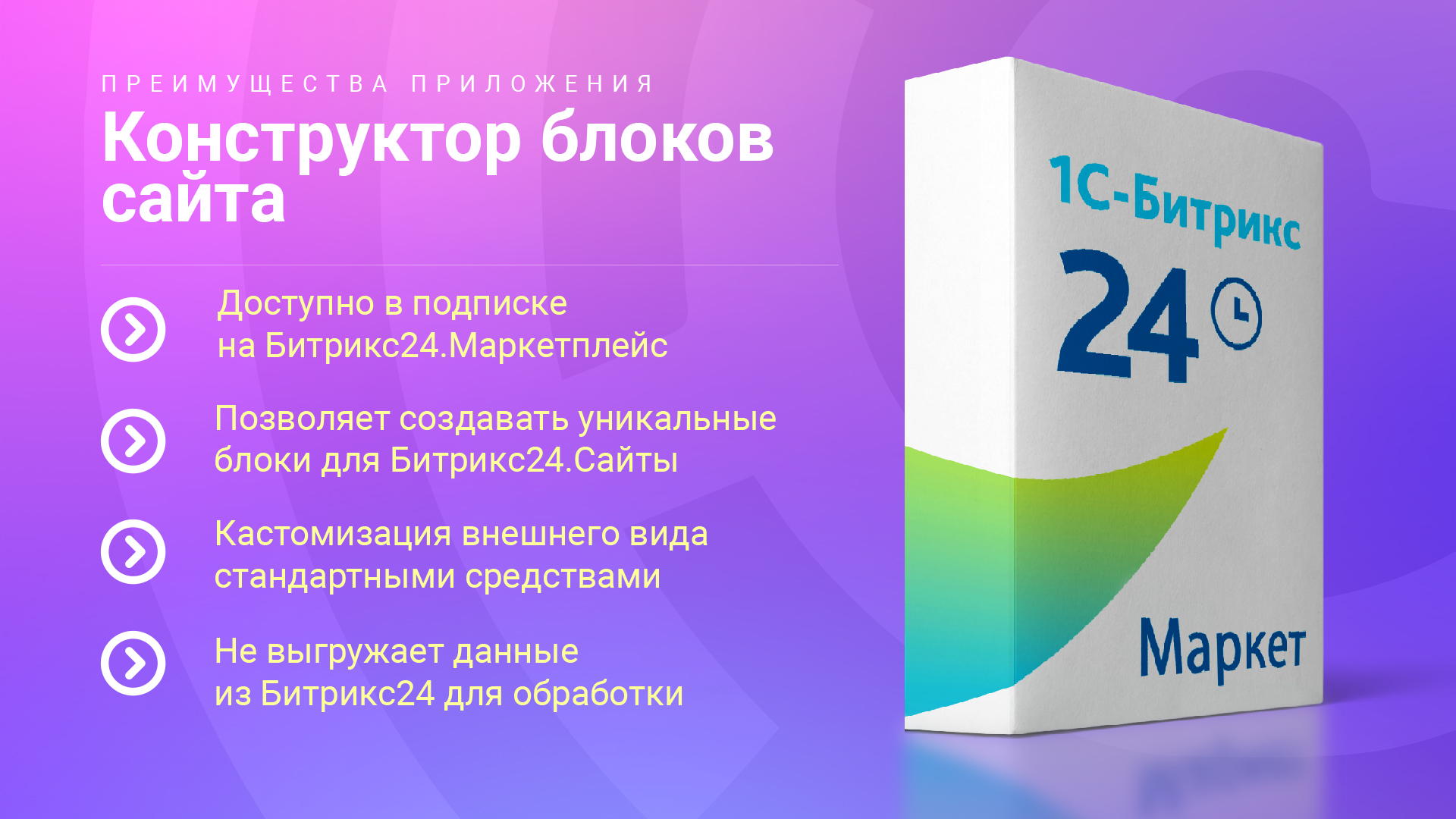 «Конструктор блоков сайта» — это инструмент для разработчиков и дизайнеров, который позволяет создавать, редактировать и настраивать собственные блоки для сайтов на платформе Битрикс24. Полный контроль над версткой, стилями, скриптами и узлами — в одном удобном интерфейсе.