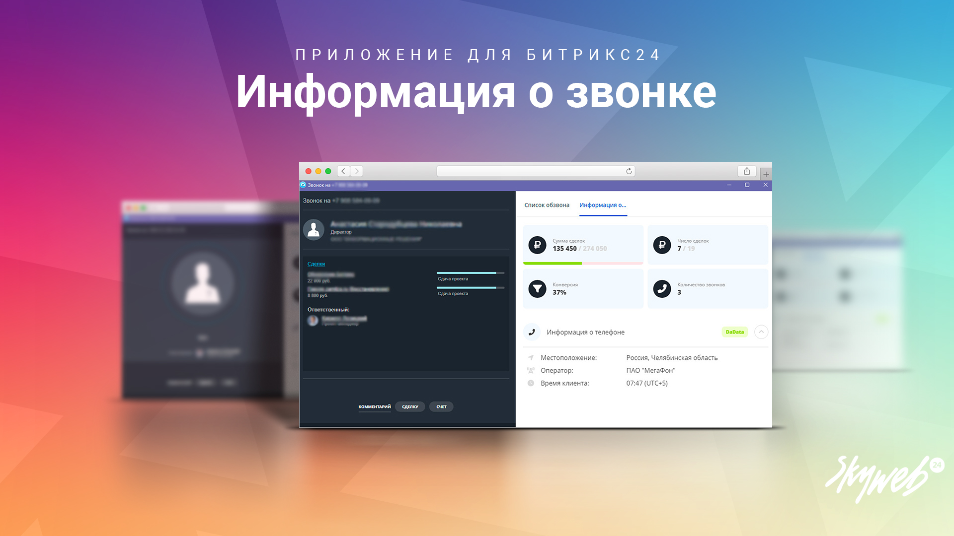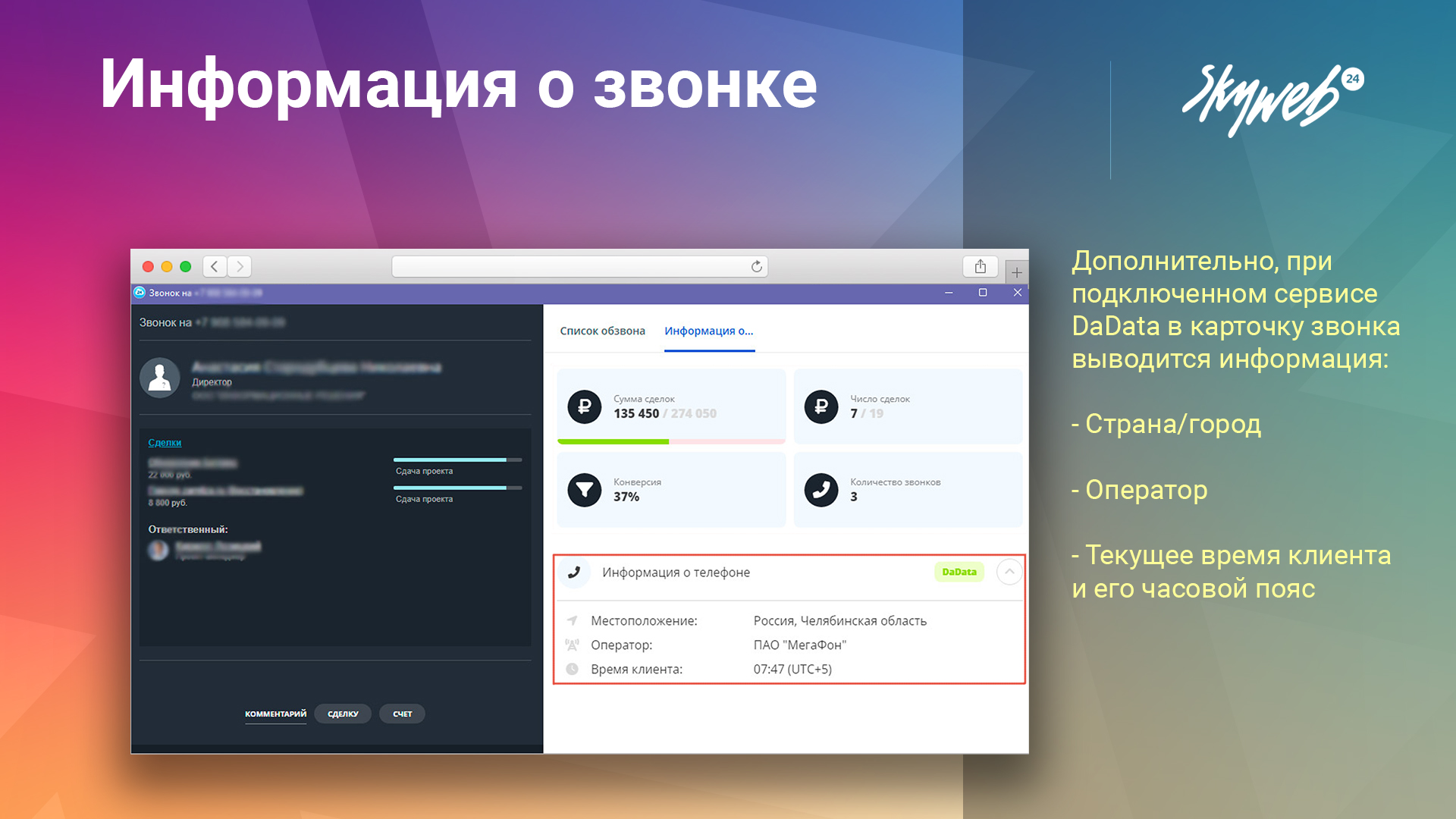 Выводит статистику клиента в карточке звонка, а также город и часовой пояс клиента (DaData)