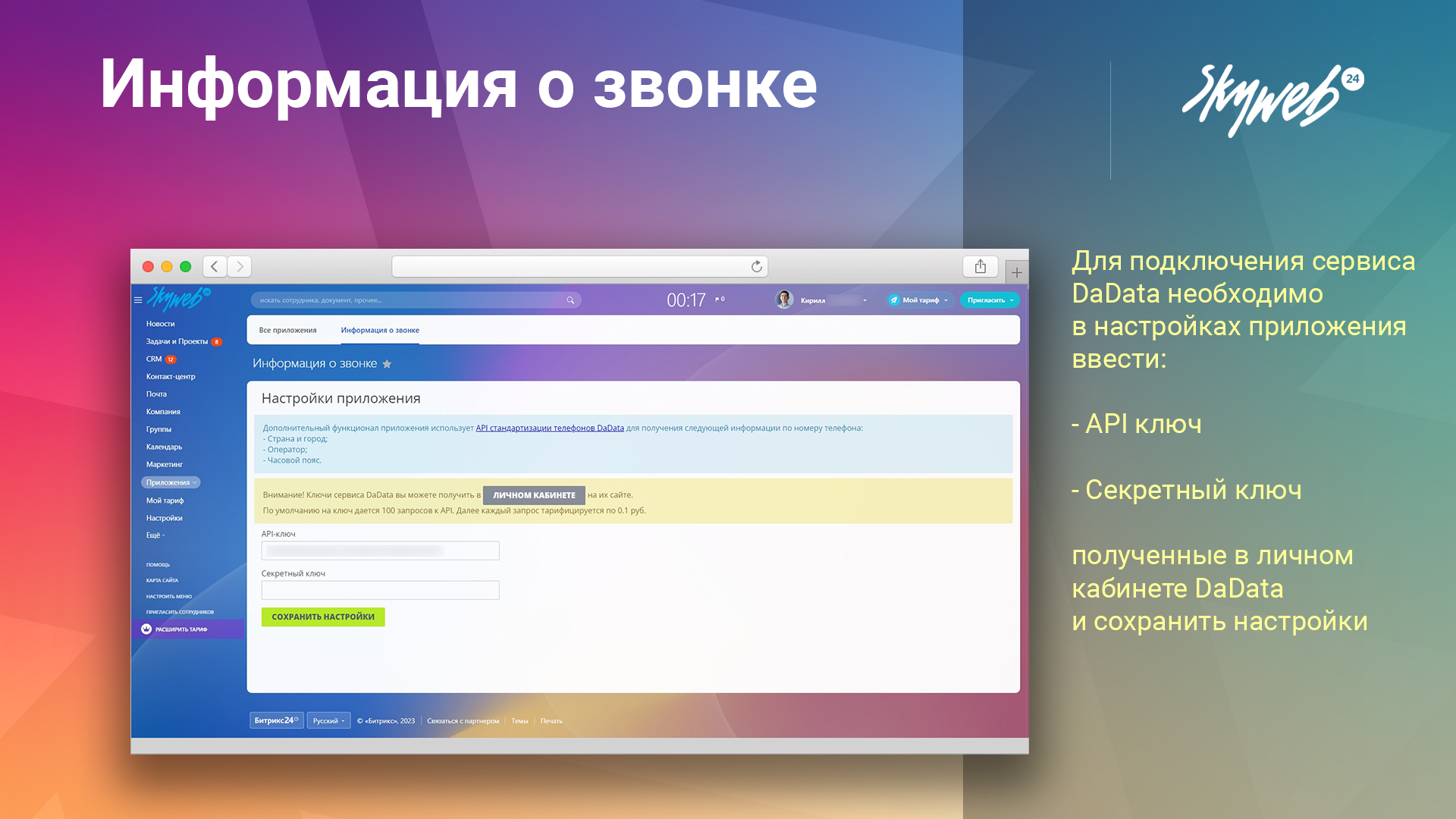 В стандартной CRM Битрикс24 нет удобного способа получения ключевых данных о клиенте во время звонка. "Информация о звонке" от Скайвеб24 решает эту проблему, предоставляя доступ к ключевым данным клиента и дополнительной информации, такой как местоположение и часовой пояс. Это позволяет операторам быстро и точно отвечать на запросы клиентов, улучшая качество обслуживания и экономя время.