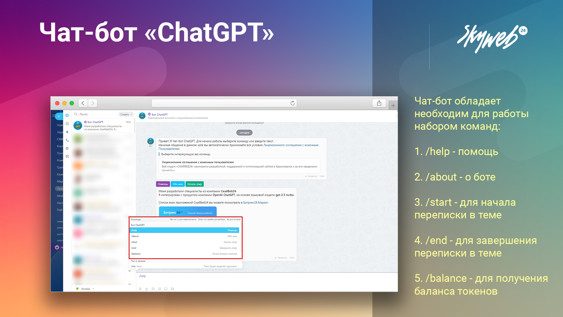 В стандартной CRM Битрикс24 нет возможности использовать искусственный интеллект для автоматизации и улучшения рабочих процессов. "ChatGPT: Умный помощник" от Скайвеб24 решает эту проблему, предоставляя доступ к ChatGPT от OpenAI, что позволяет быстро и точно находить необходимую информацию, генерировать тексты, консультироваться по любым вопросам и даже писать код.