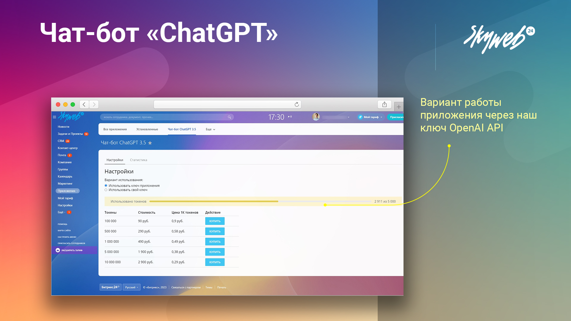 Использование нашего ключа OpenAI — приложение самостоятельно следит за лимитами вашего портала, и вам остается только купить нужное количество токенов удобным способом.