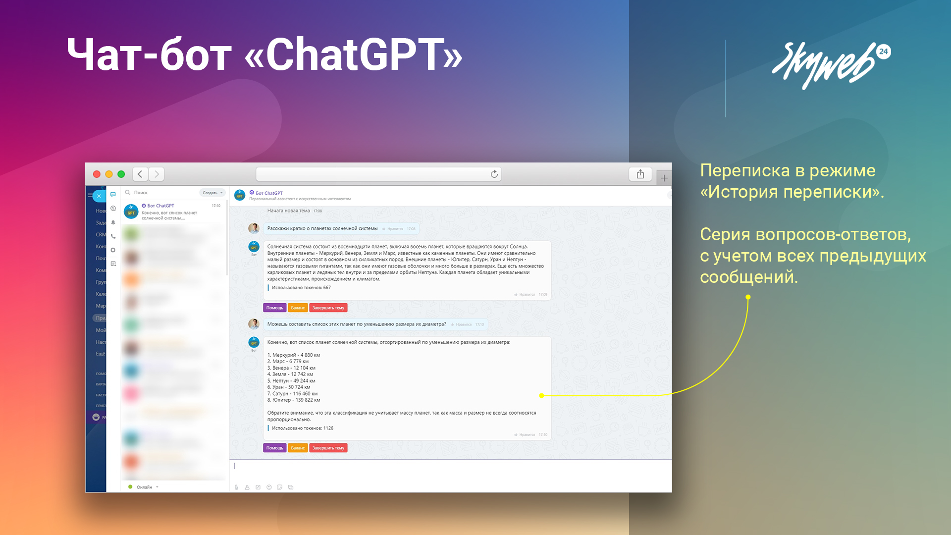 Режим "История переписки" — ведение переписки по определенной теме и сохранение истории предыдущих вопросов. Возможность задавать уточняющие вопросы в текущем контексте, пересылая всю историю переписки в рамках выбранной темы.
