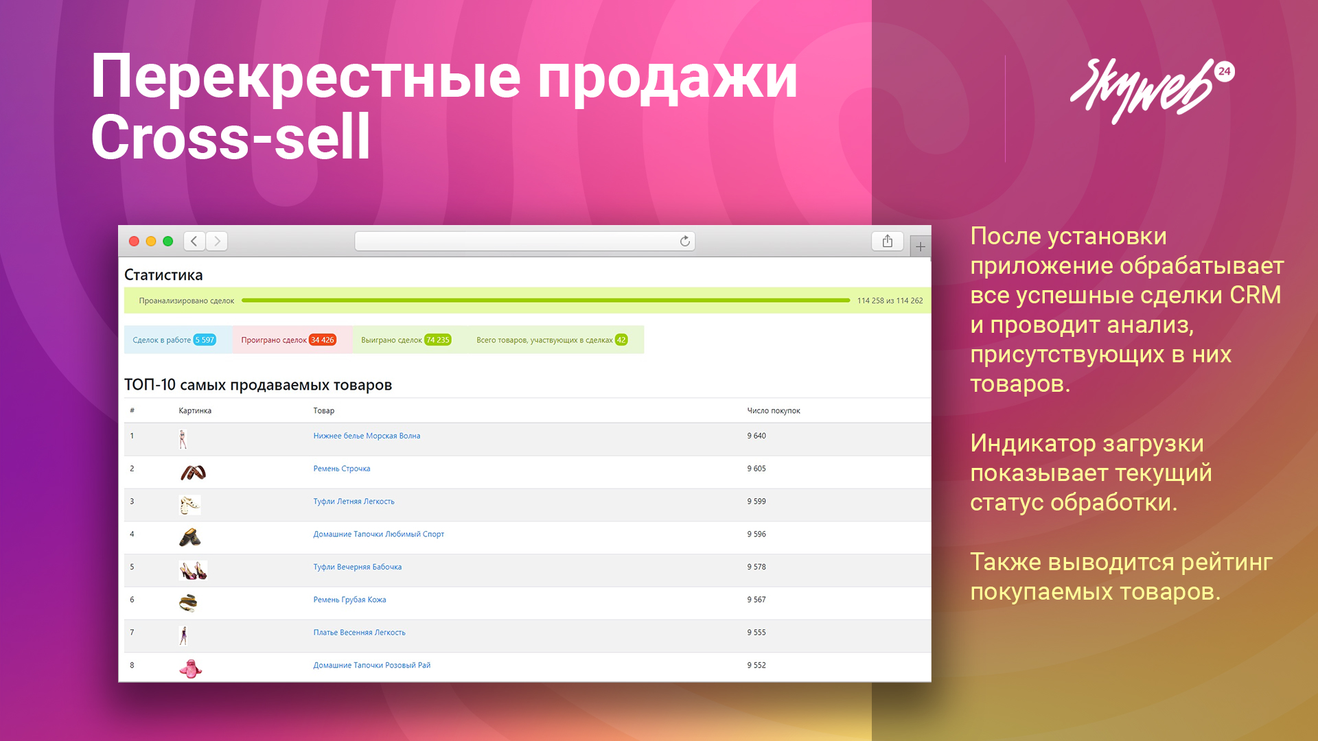Приложение анализирует все сделки в вашей CRM и выявляет товары, участвовавшие в них.