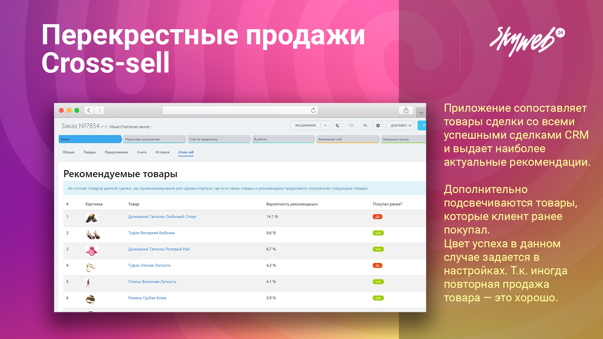 Полезный инструмент для менеджеров, который помогает предлагать покупателям наиболее релевантные товары на основе анализа предыдущих сделок в вашей CRM.