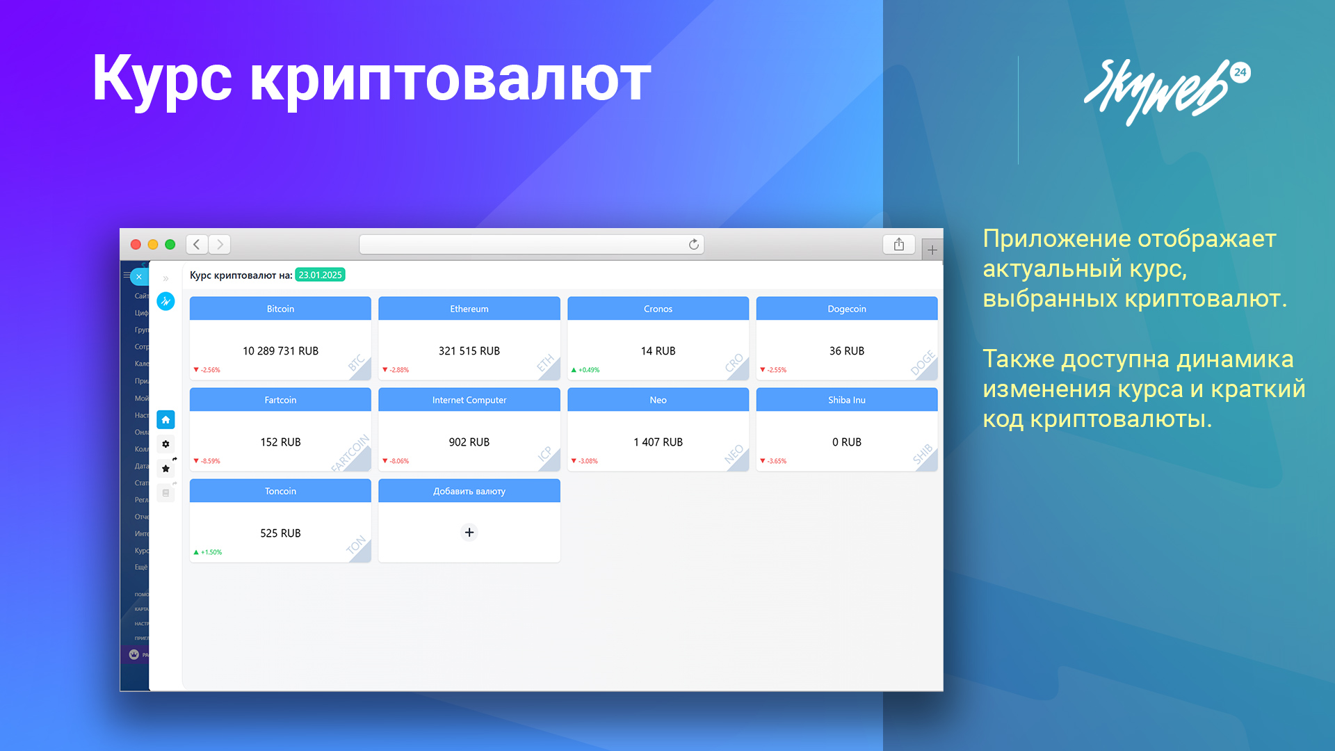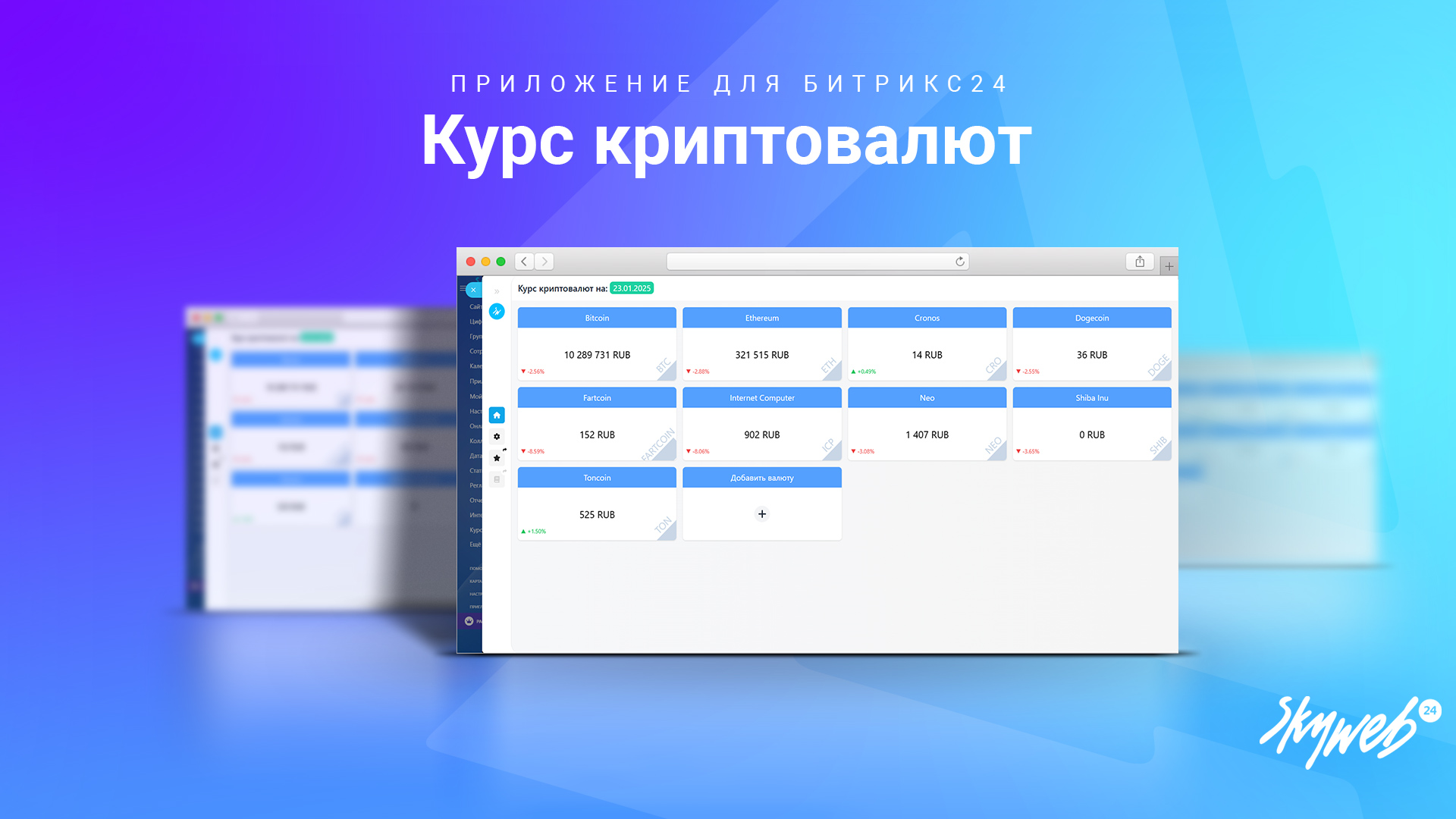 В стандартной CRM Битрикс24 нет удобного способа для автоматического обновления курсов криптовалют. "Курс криптовалют" от Скайвеб24 решает эту проблему, предоставляя инструмент для автоматического обновления и отслеживания курсов криптовалют на основе информации из биржи.