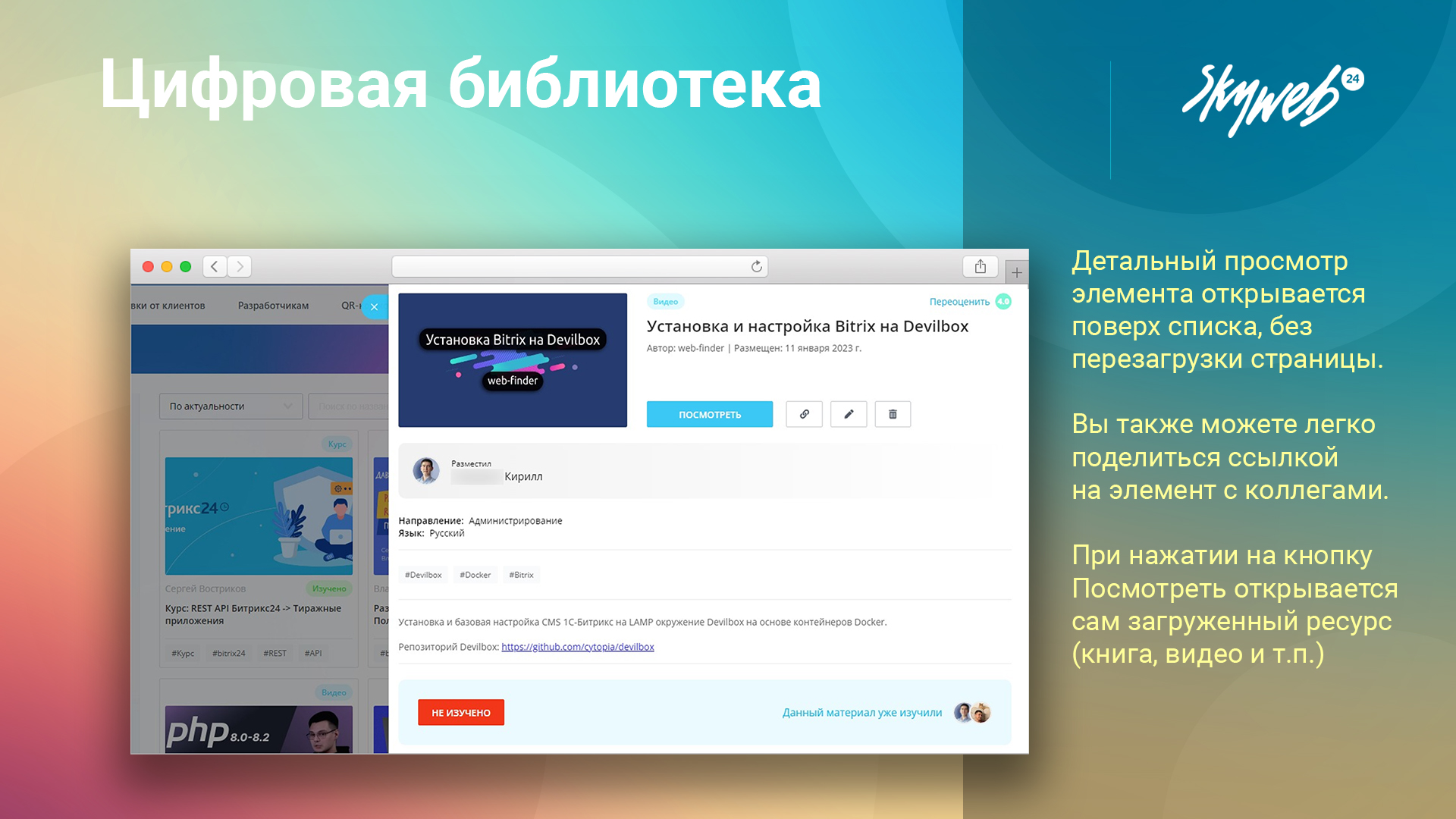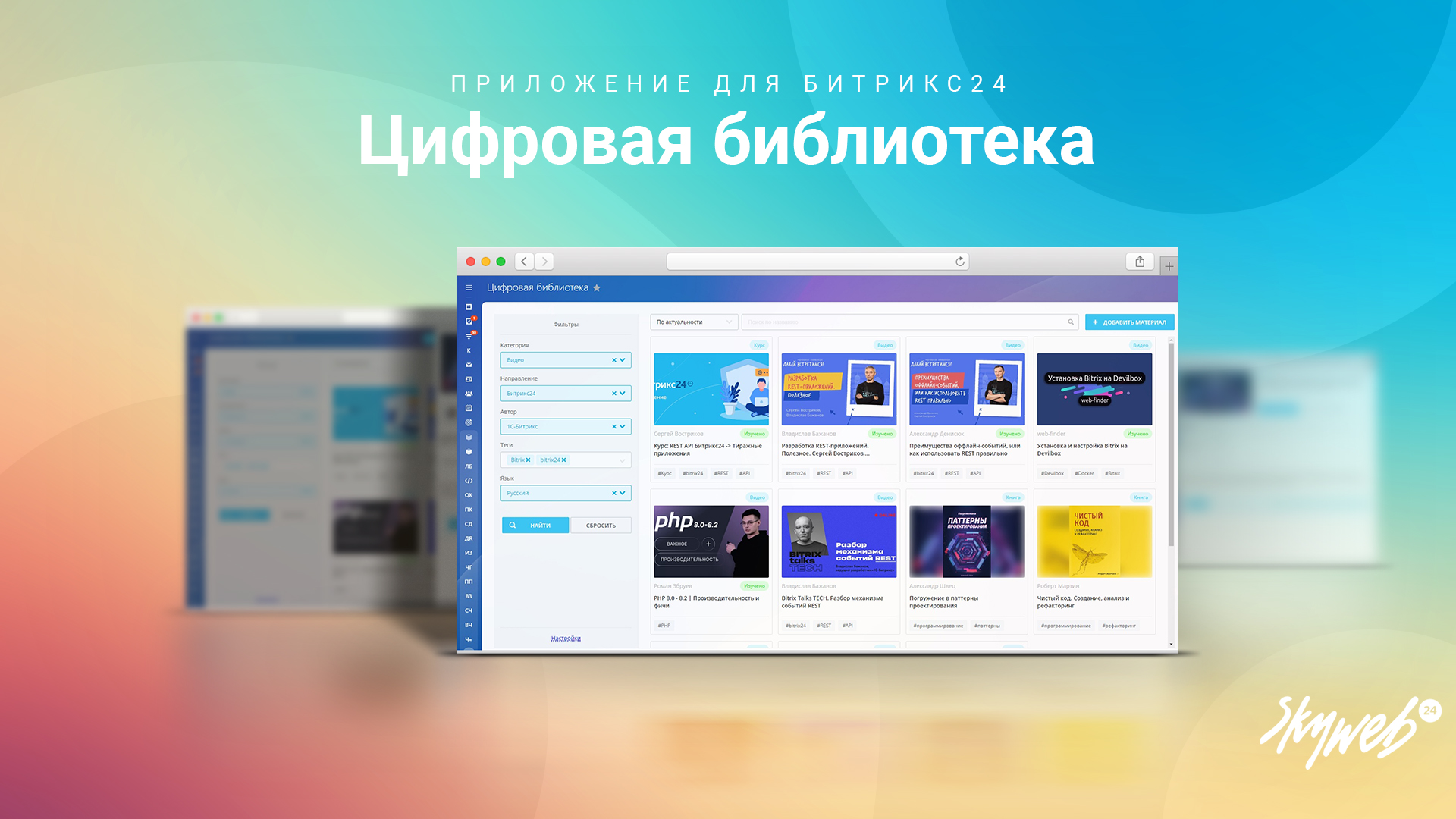 В стандартной CRM Битрикс24 нет удобного способа организовать корпоративную библиотеку для хранения и передачи знаний. "Цифровая библиотека" от Скайвеб24 решает эту проблему, предоставляя возможность структурированного хранения книг, видео и статей в одном месте. Это ускоряет процесс получения знаний, помогает накапливать и осваивать информацию, а также способствует поддержке самообразования сотрудников.