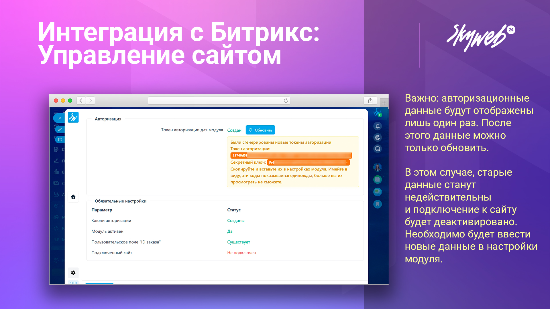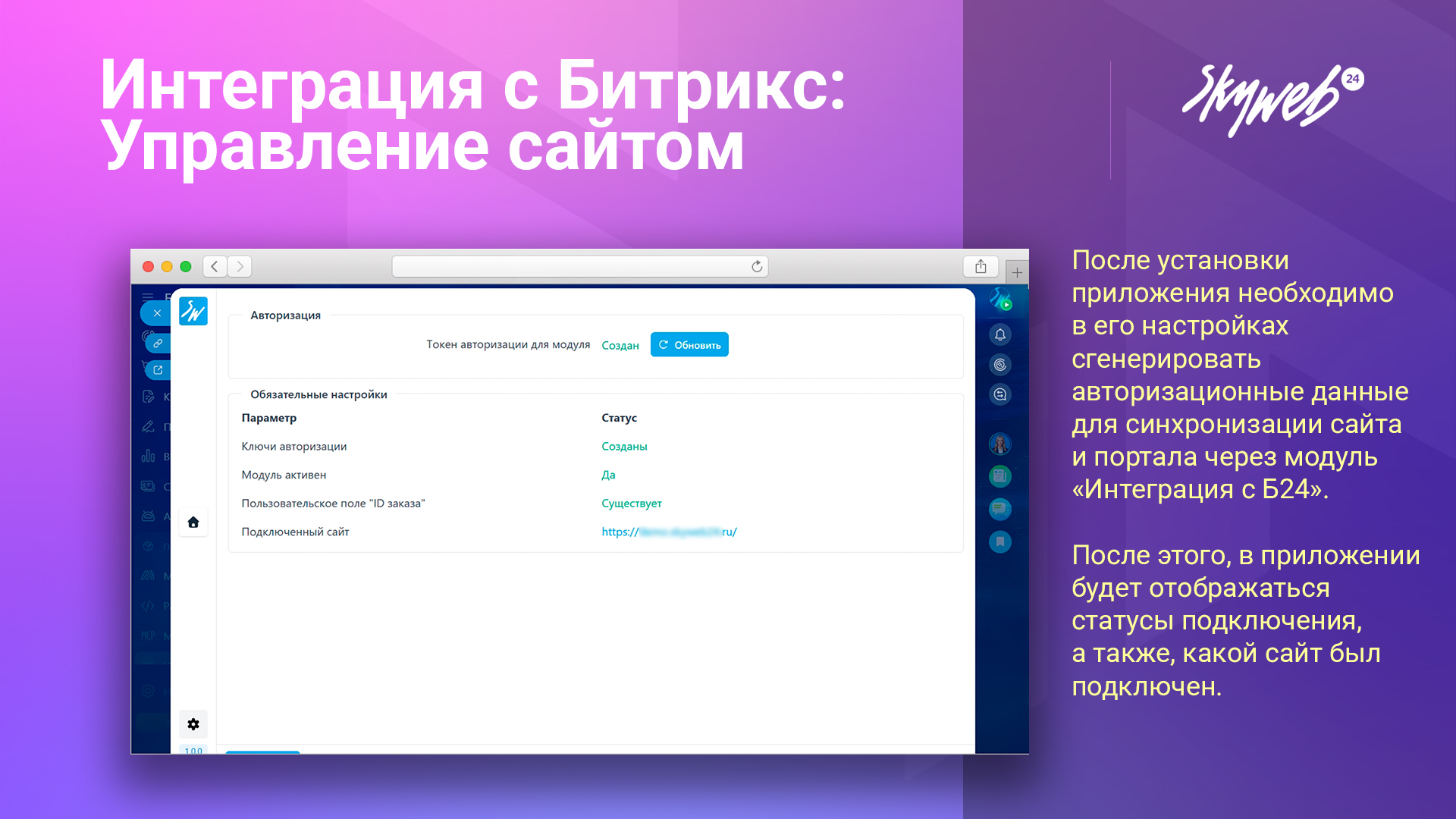 Связка приложения «Интеграция с Битрикс: Управление сайтом» и модуля «Интеграция с Б24» создаёт надёжную, защищённую и полностью рабочую интеграцию между БУС и CRM. Эти два продукта обеспечивают корректный двухсторонний обмен заказами и статусами, поддерживают актуальность клиентской базы и формируют единое информационное пространство. В итоге интернет‑магазин и Битрикс24 работают синхронно, без ошибок и ручных доработок.