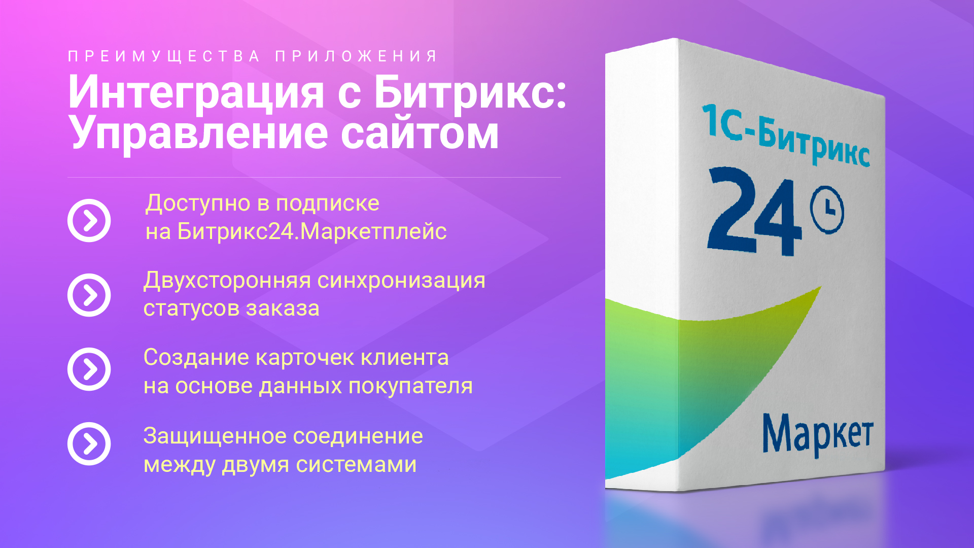 Приложение «Интеграция с Битрикс: Управление сайтом» работает в связке с модулем «Интеграция с Б24» и обеспечивает корректную передачу данных заказов и их статусов между сайтом на БУС и CRM Битрикс24.