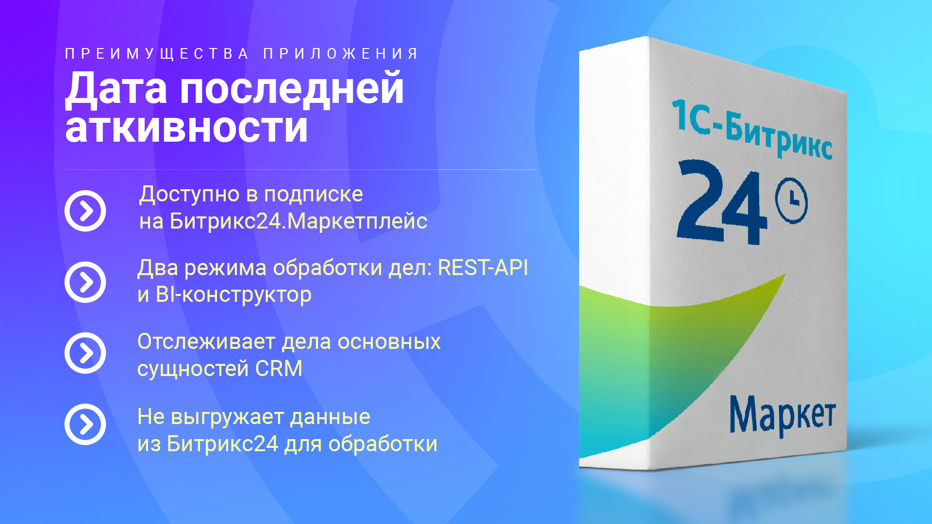 Приложение решает проблему отсутствия возможности видеть дату последней коммуникации с клиентом в стандартном функционале Битрикс24. Оно записывает дату последней коммуникации в пользовательское поле «Дата активности».