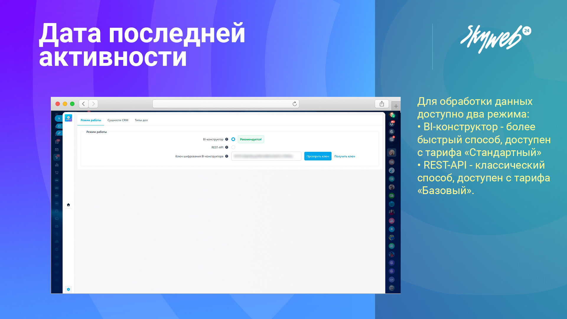 - BI-конструктор (требуется ключ шифрования BI-конструктора) — быстрая обработка данных за один запрос.