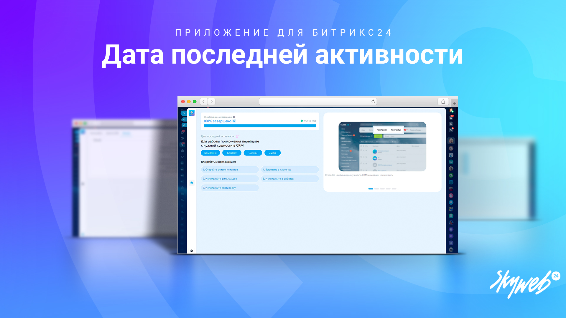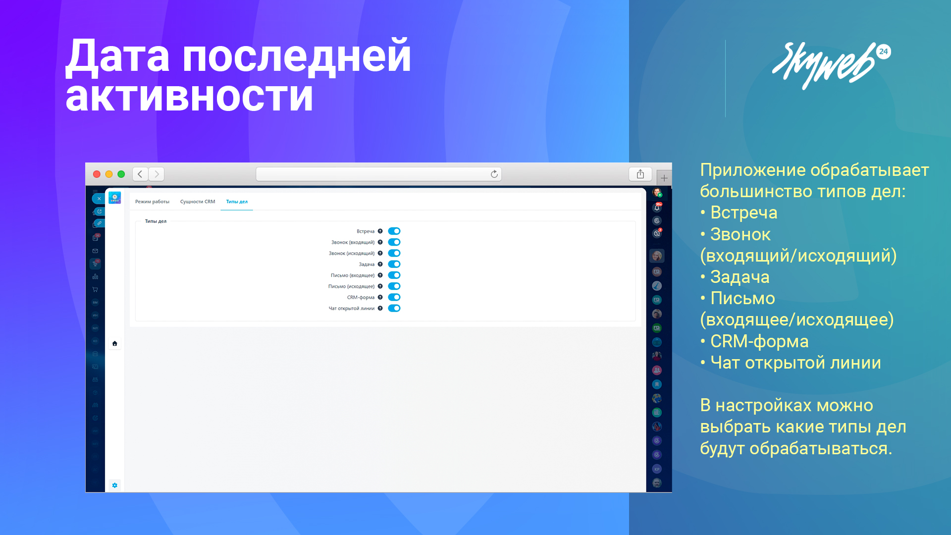 В стандартной CRM Битрикс24 нет удобного способа для отслеживания даты последней коммуникации с клиентом. "Дата последней активности" от Скайвеб24 решает эту проблему, предоставляя инструмент для записи даты последней коммуникации в пользовательское поле, что помогает улучшить управление контактами и компаниями в CRM.