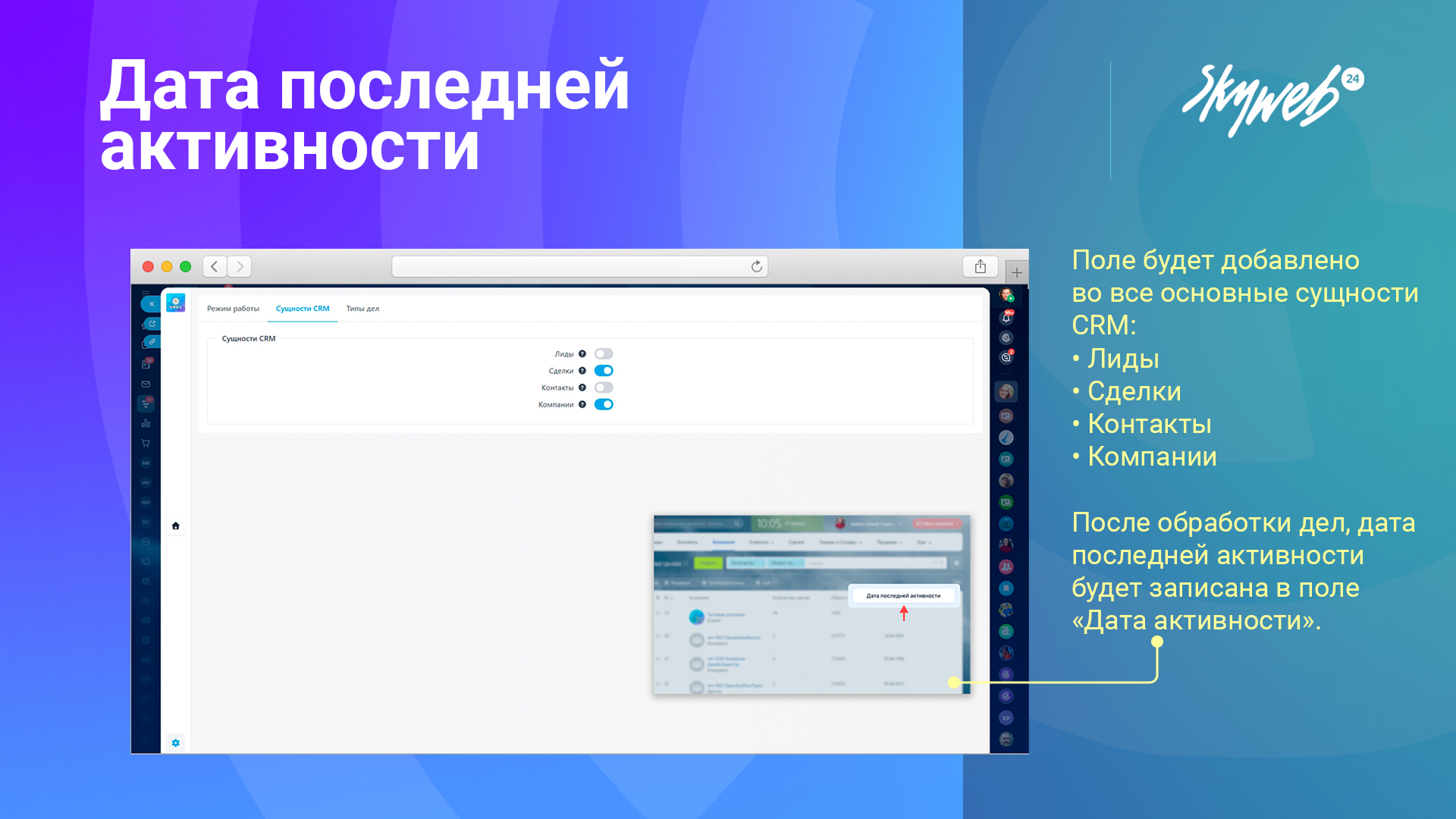 Дата последней активности на детальной странице просмотра контакта или компании упрощает анализ и управление.