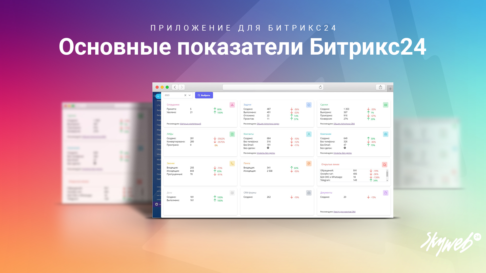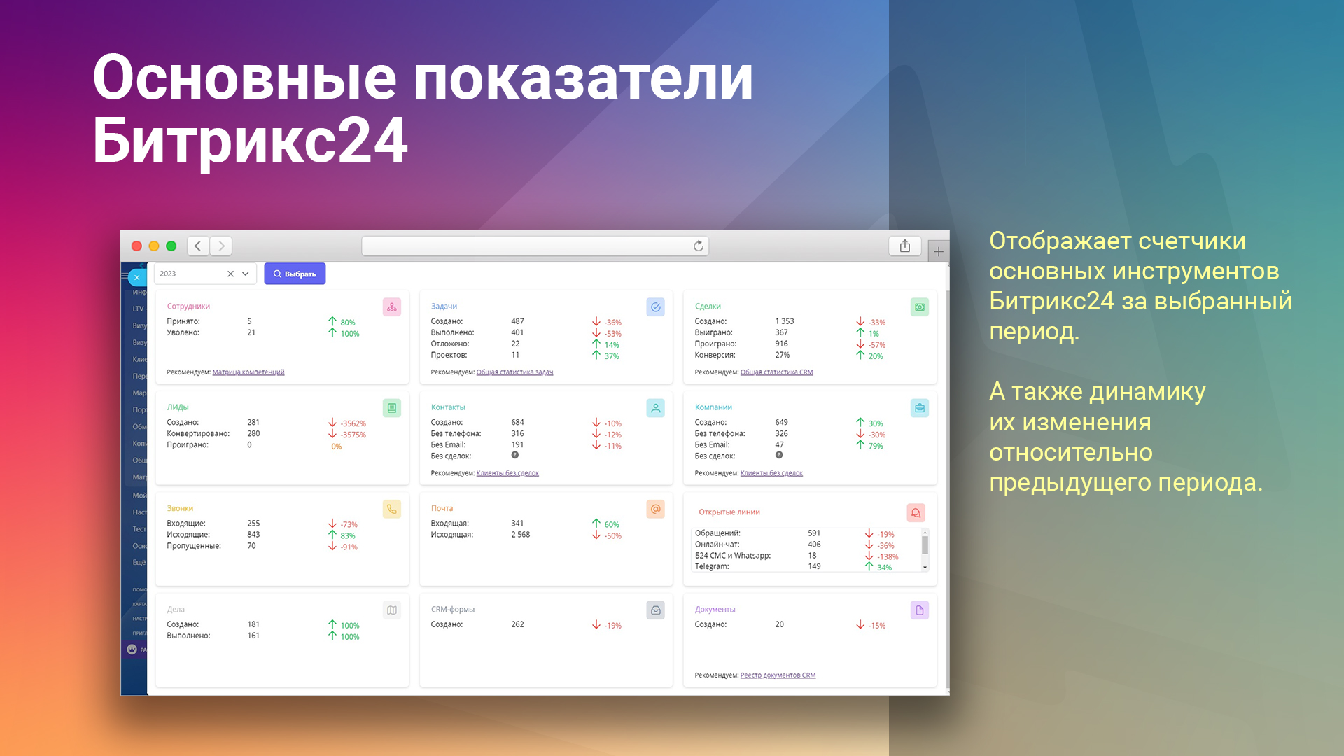 Приложение показывает счетчики по основным инструментам вашего портала Битрикс24 за выбранный период времени, а также динамику их изменения относительно предыдущего периода.