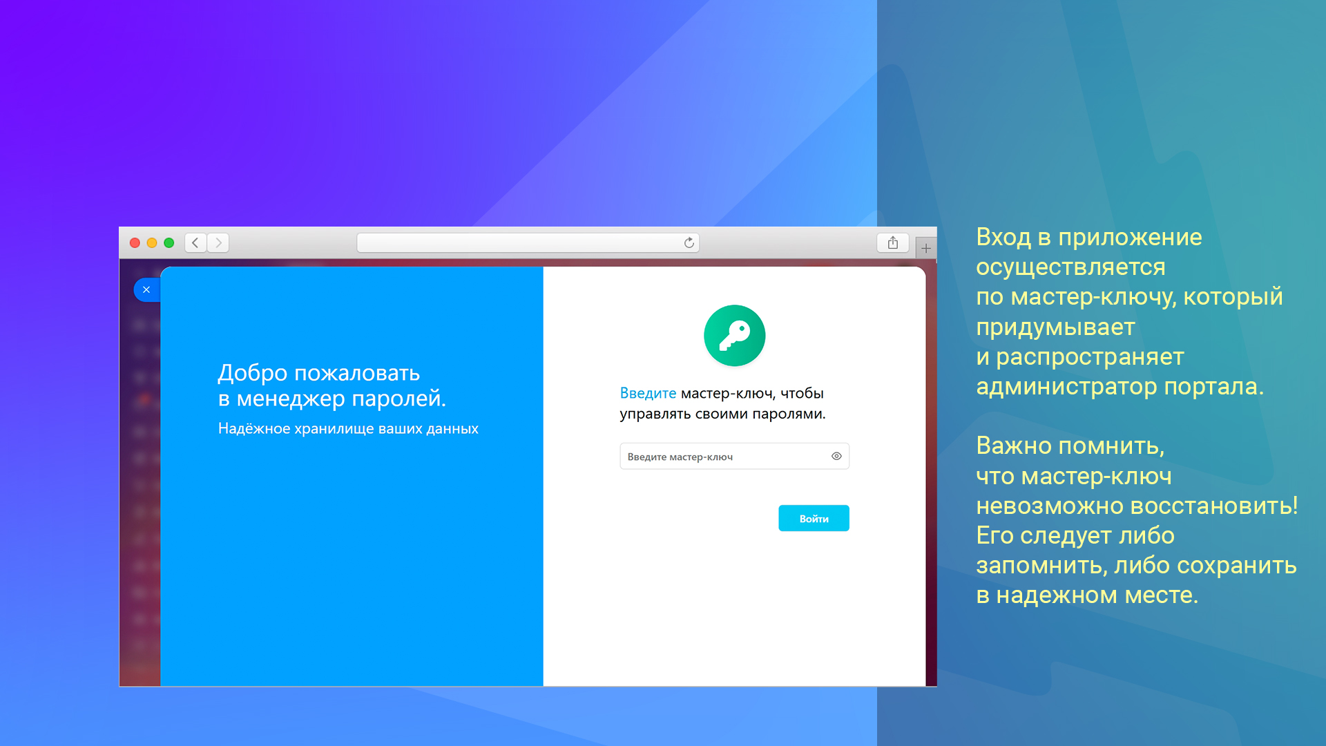 Приложение защищено дополнительным уровнем безопасности — для входа требуется мастер-ключ. Важно помнить, что мастер-ключ невозможно восстановить! Его следует либо запомнить, либо сохранить в надежном месте.